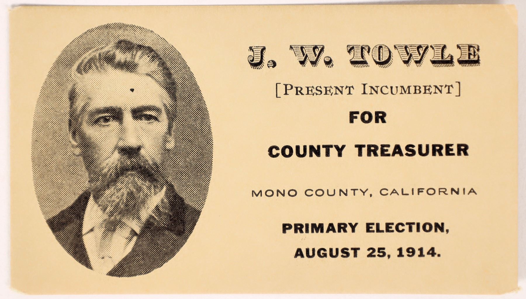 Pictorial, on cardstock. J.W. Towle, Present Incumbent for County Treasurer, Mono County, California, Primary Election, August 25, 1914. Portrait photo of Towle. 2 x 3.5" Towle, a Republican, was involved in Mono County politics and civil service dating back to the 1870s.