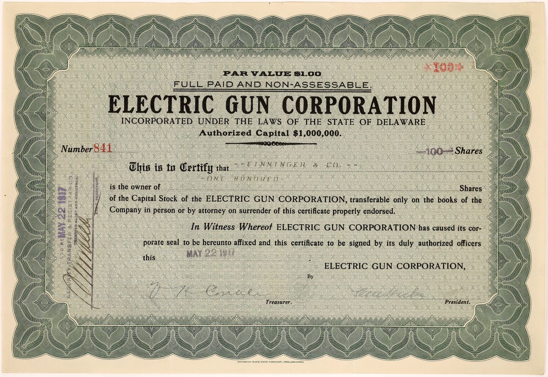 An unusual stock certificate issued by The Electric Gun Corporation. It was issued on May 22, 1917 to Enninger & Company. for 100 shares at $1 per share.