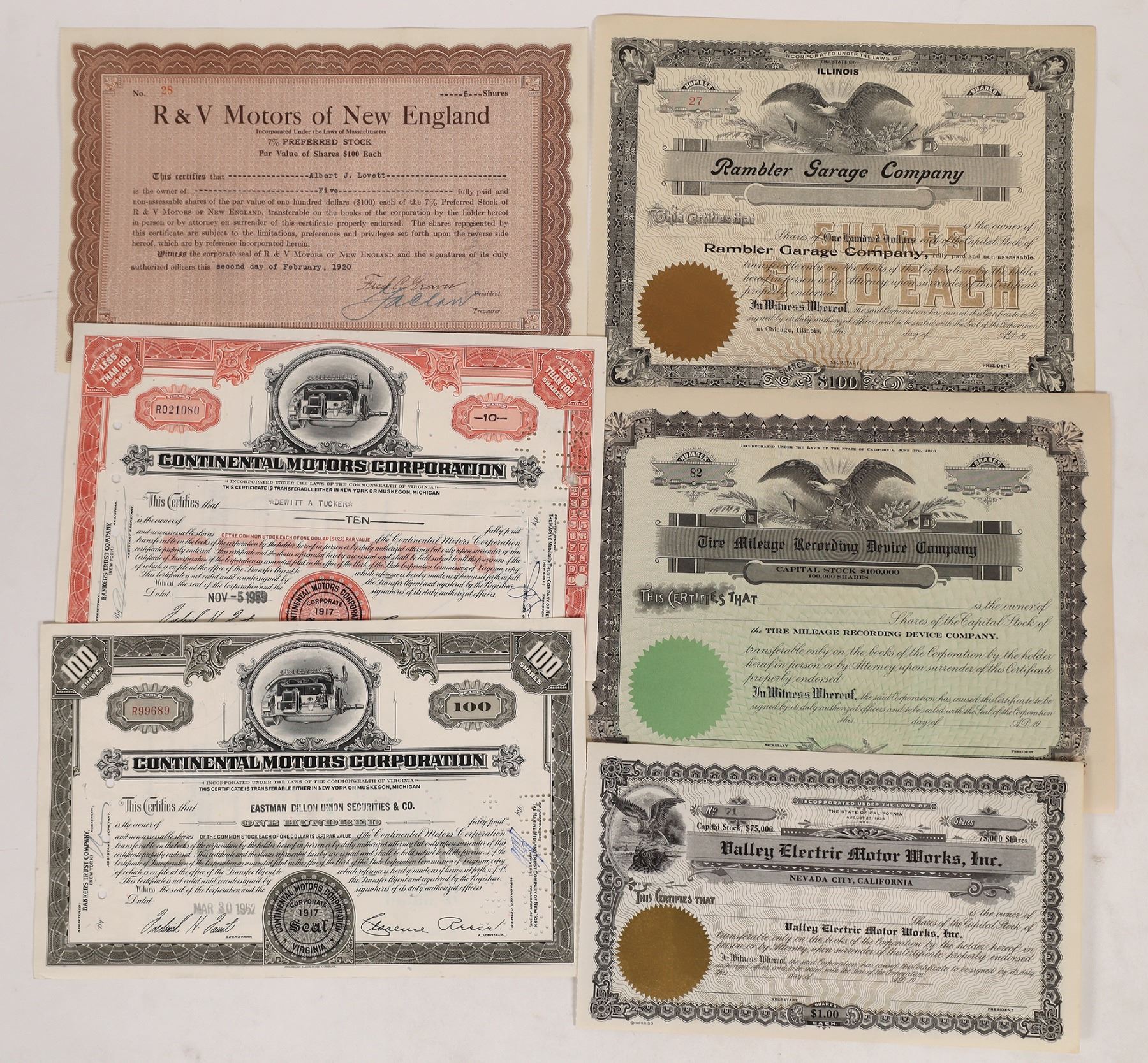 A set of six different stock certificates related to the electric motors industry, c1920-62. See photo(s) for more details. Ken Prag Collection