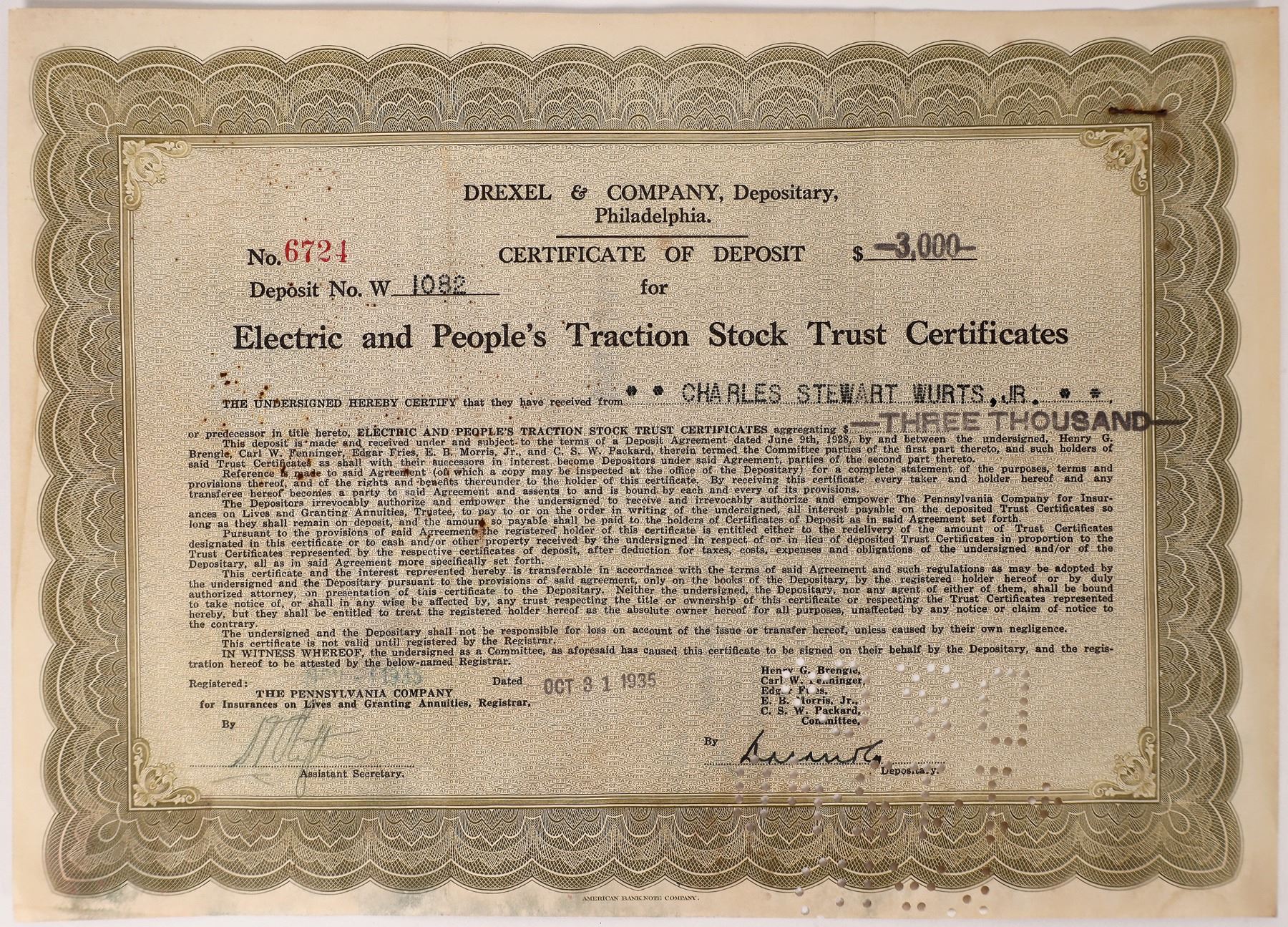 Electric and People's Traction Stock Trust Certificates, Certificate of Deposit, Bond, No. 6724, $3000, received from Charles Stewart Wurts, Jr., signed by Assistant Secretary and Depositary (illegible), 1935, 11x8", i/c, 1 cert