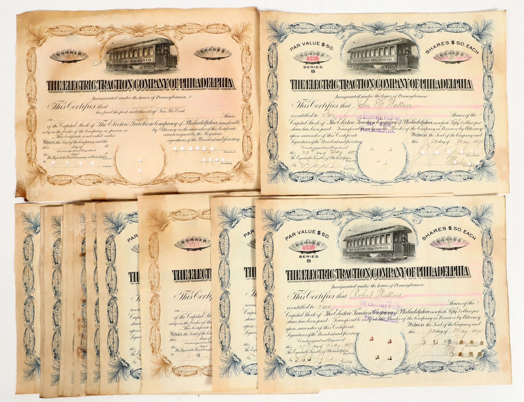 About 20 issued stock certificates from The Electric Traction Company of Philadelphia. Street car vignette; blue or brown ink; some condition issues.