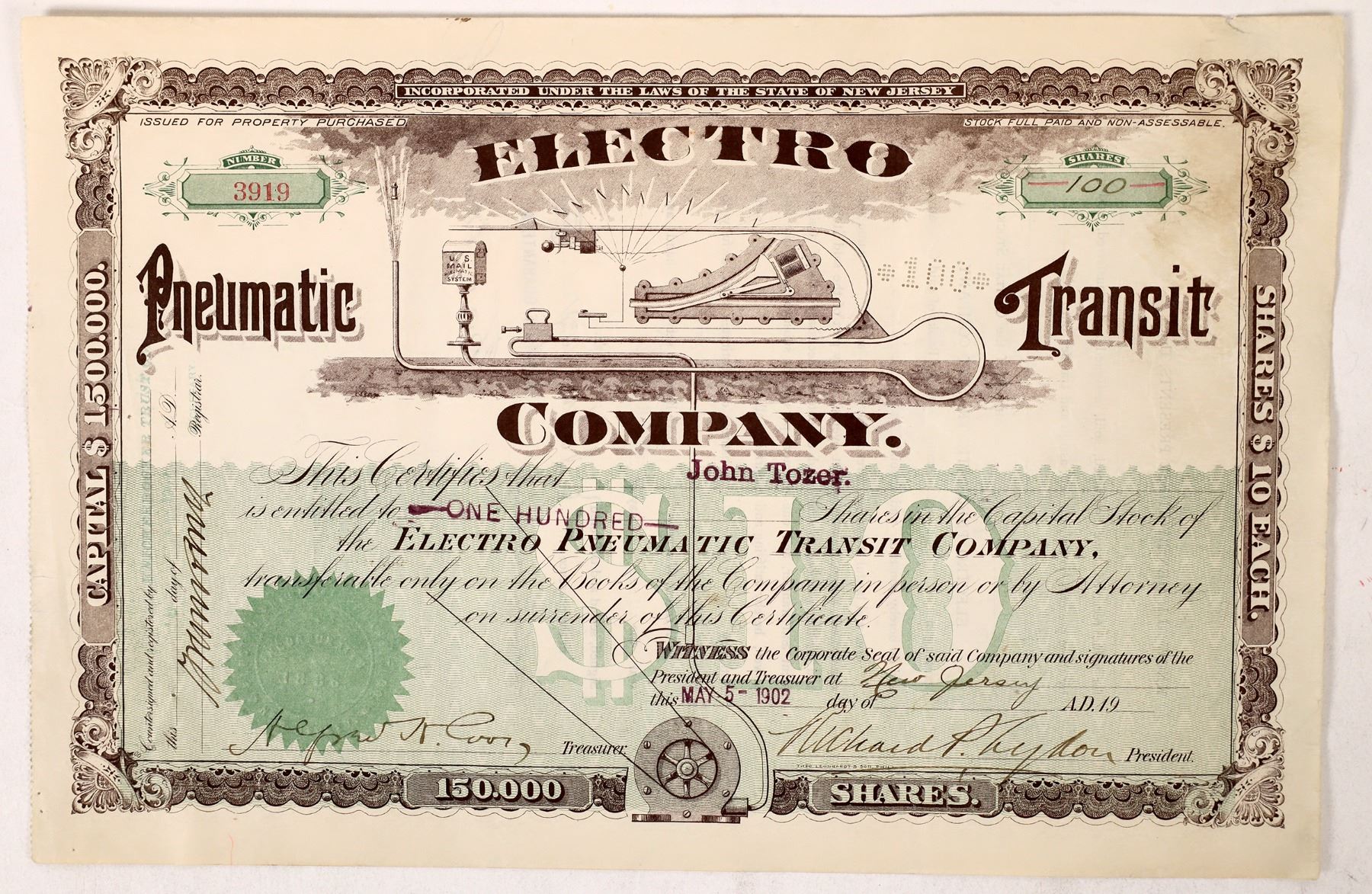 In 1887, An ordinance was granted the Electro - Pneumatic Transit Company the privilege of placing pneumatic tubes under certain streets in the City of Philadelphia . Great vignette of a gear at the bottom with tubes radiating up showing machinery and a U.S. Mail Automatic System. Electro Pneumatic systems are still produced today for robotics and automation. Scarce certificate is uncanceled. _x000D_ New Jersey