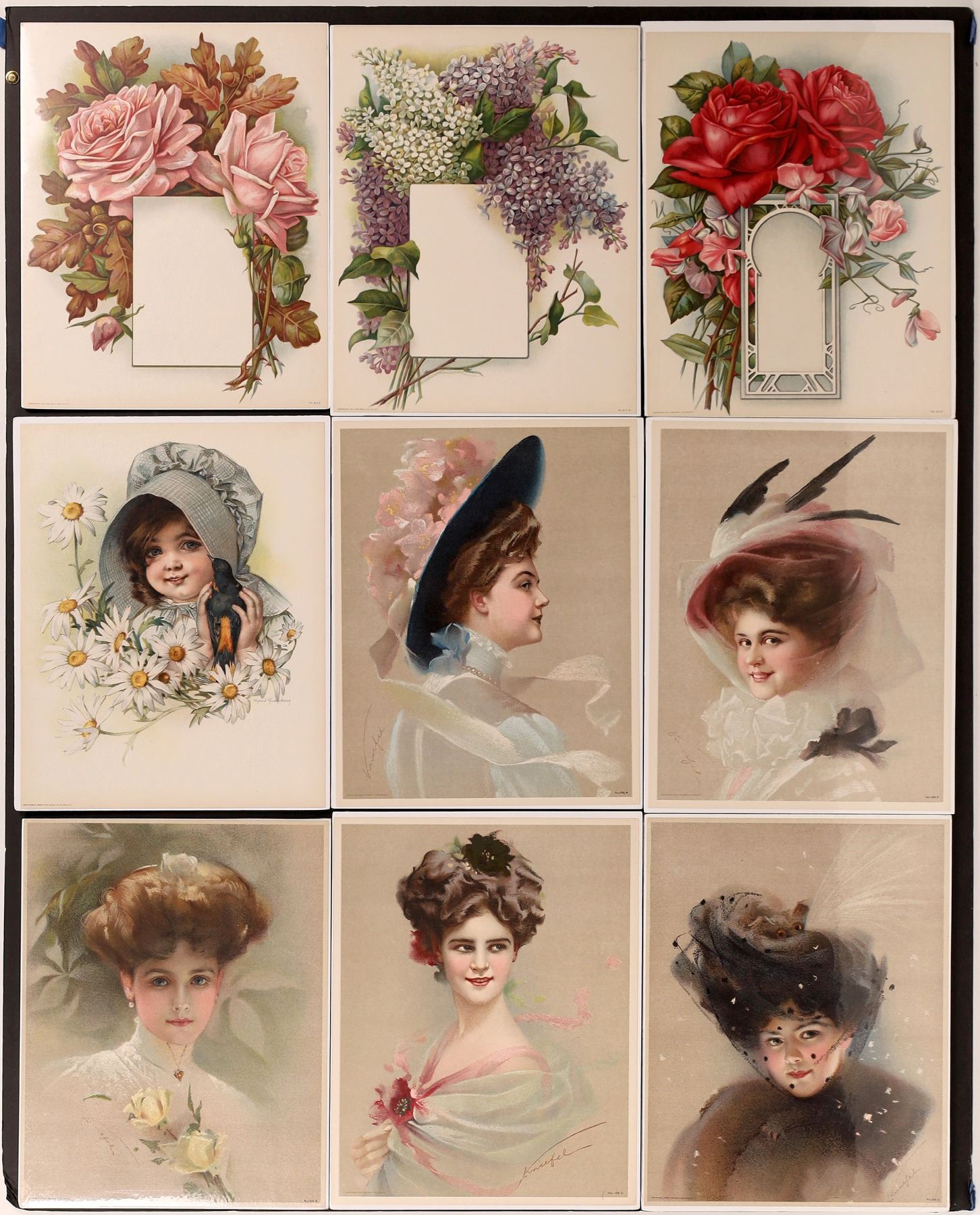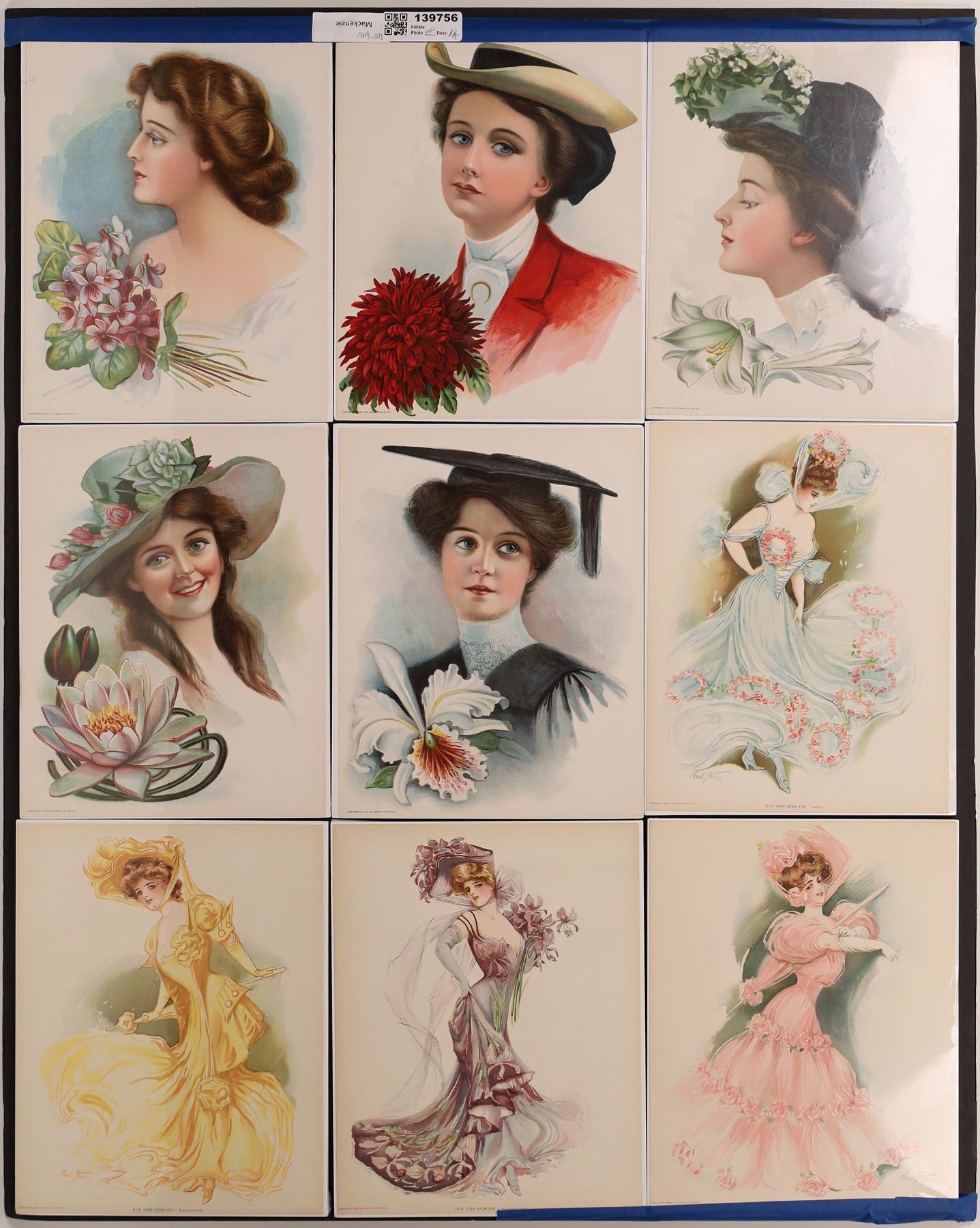Lot of eighteen 10 x 13-inch color lithographs by Gray Lithographers of New York. Some have artists signatures: Maud Humphrey and others. New York Show Girls, Copyright between 1905-1910. Three are not women, but artistic framing flowers for invitations and the like.
