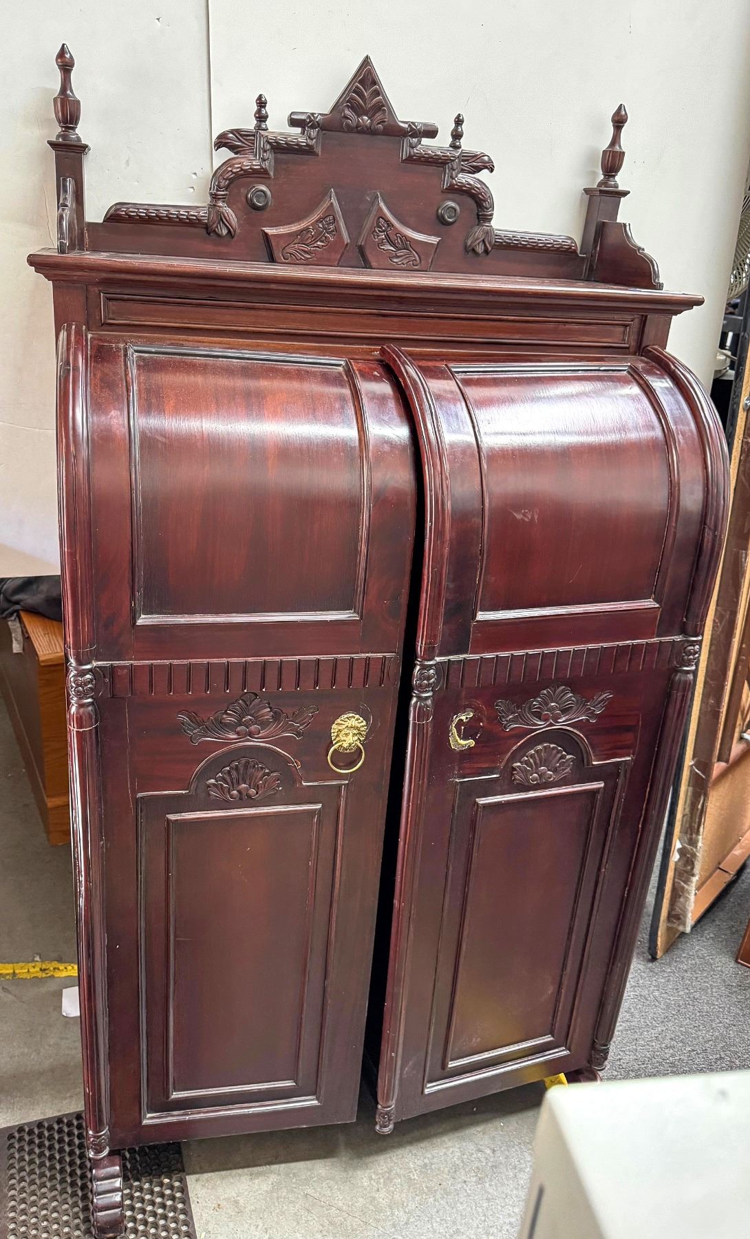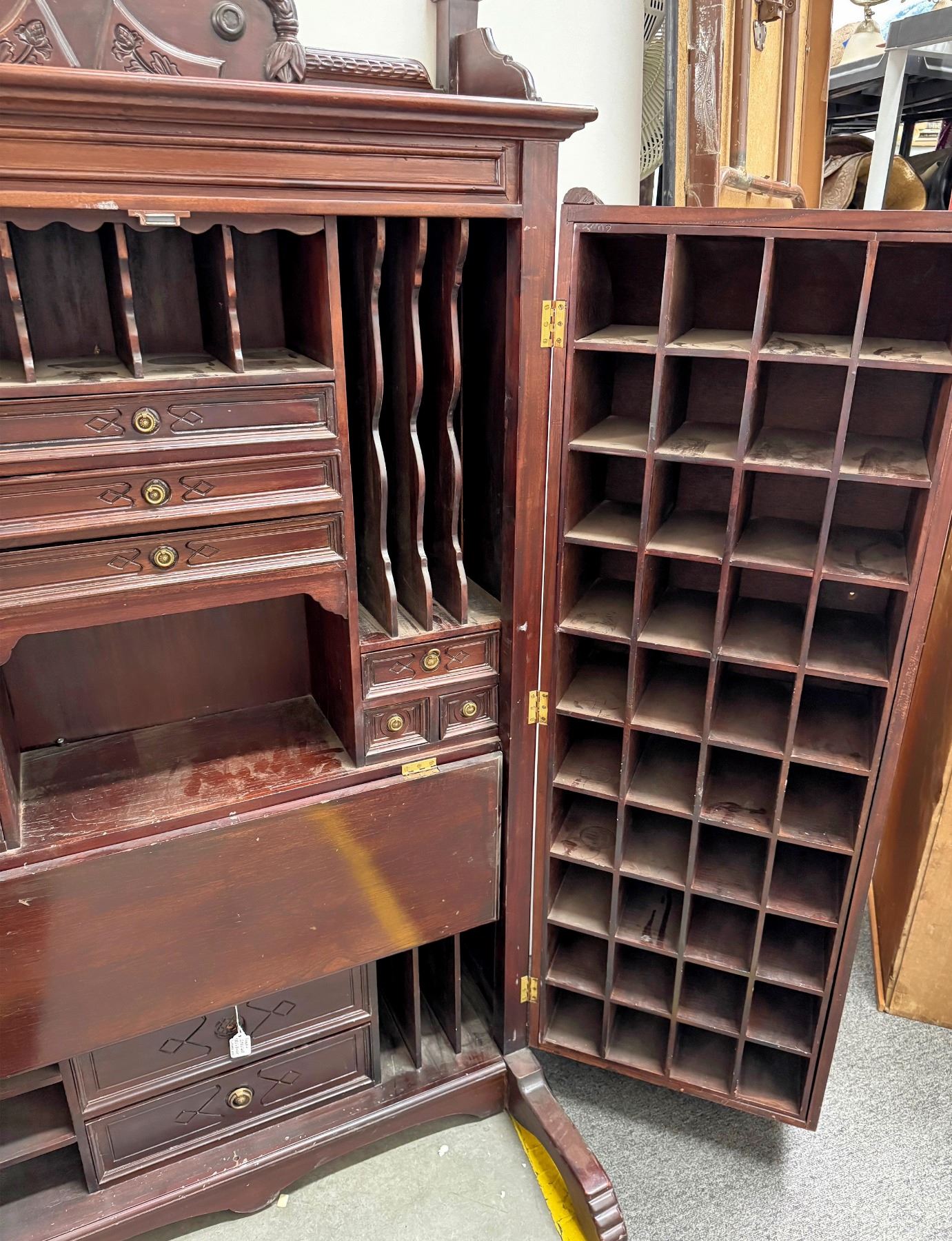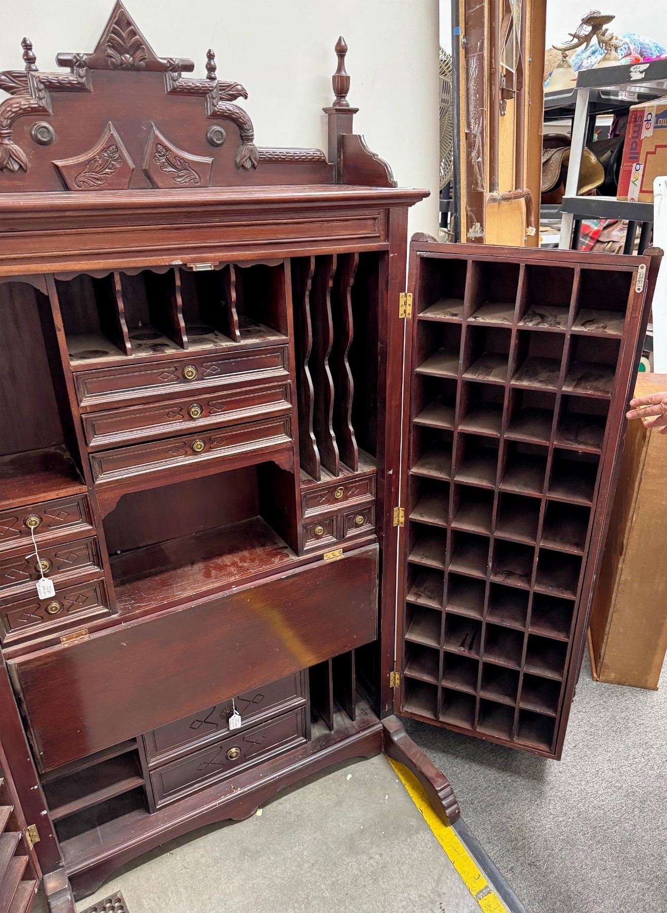 An elegant Wooten desk replica in a gorgeous espresso color with a detachable top adornment measuring 11". The body of this piece is 59" tall when not including the adornment. The swinging doors are 19" wide, and reveal a desk supported by a pair of pull-out rods.