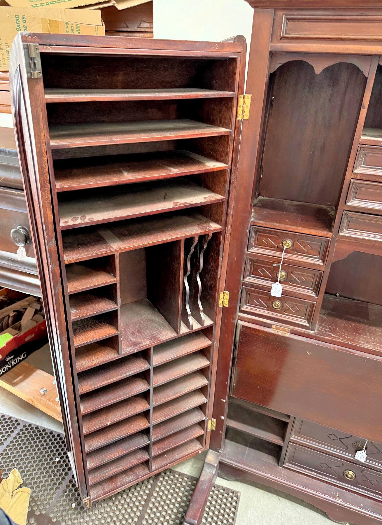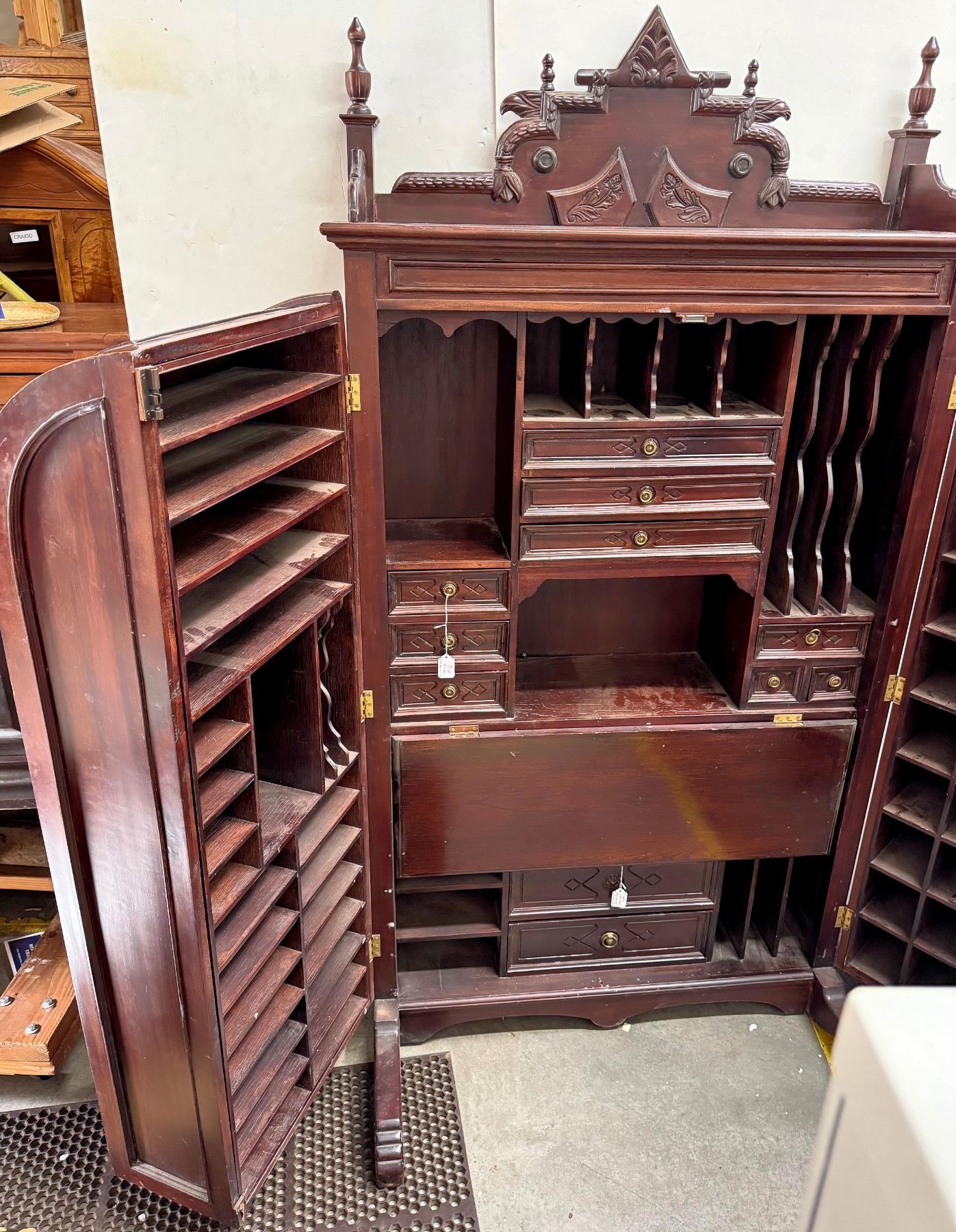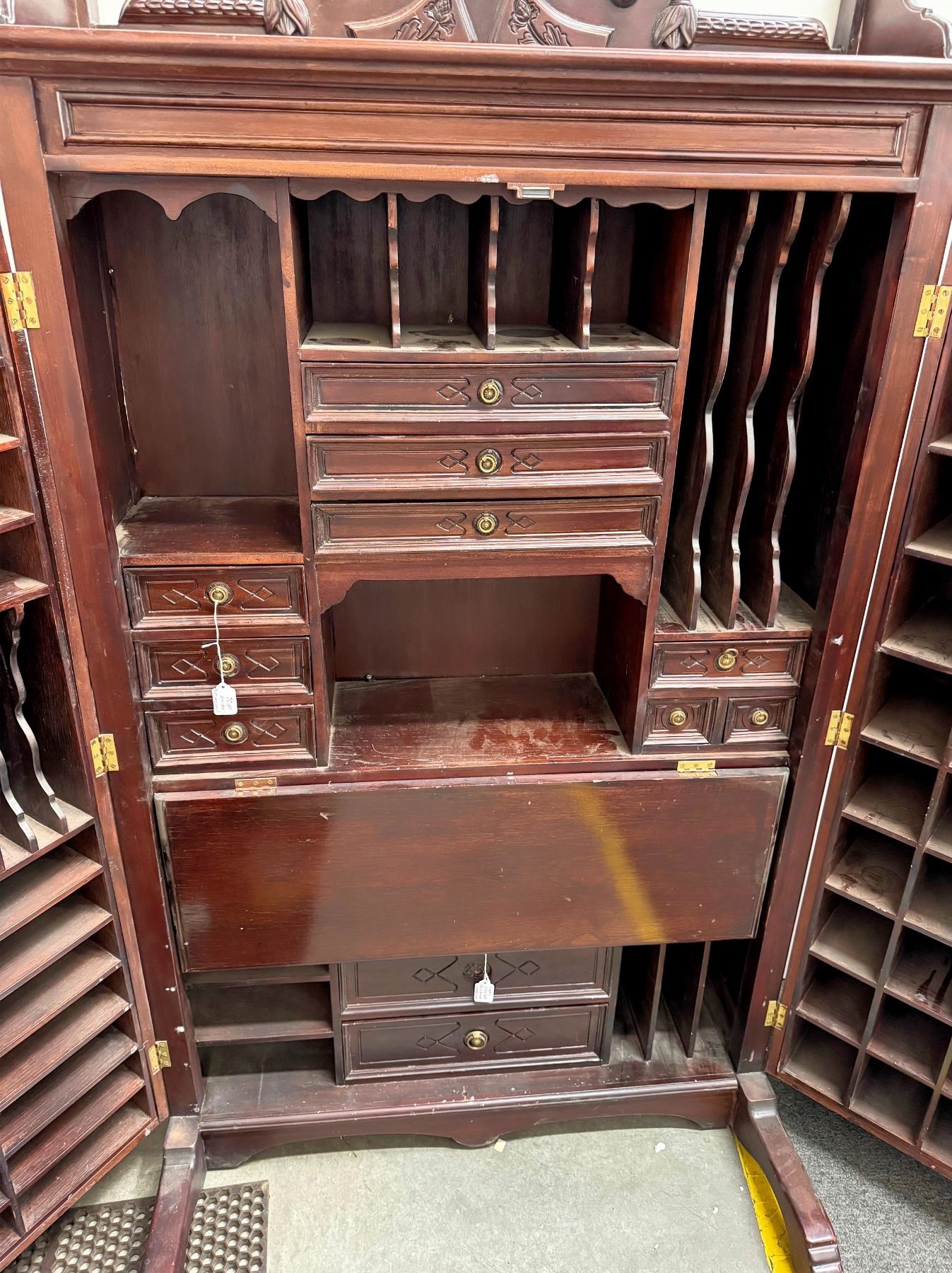 An elegant Wooten desk replica in a gorgeous espresso color with a detachable top adornment measuring 11". The body of this piece is 59" tall when not including the adornment. The swinging doors are 19" wide, and reveal a desk supported by a pair of pull-out rods.
