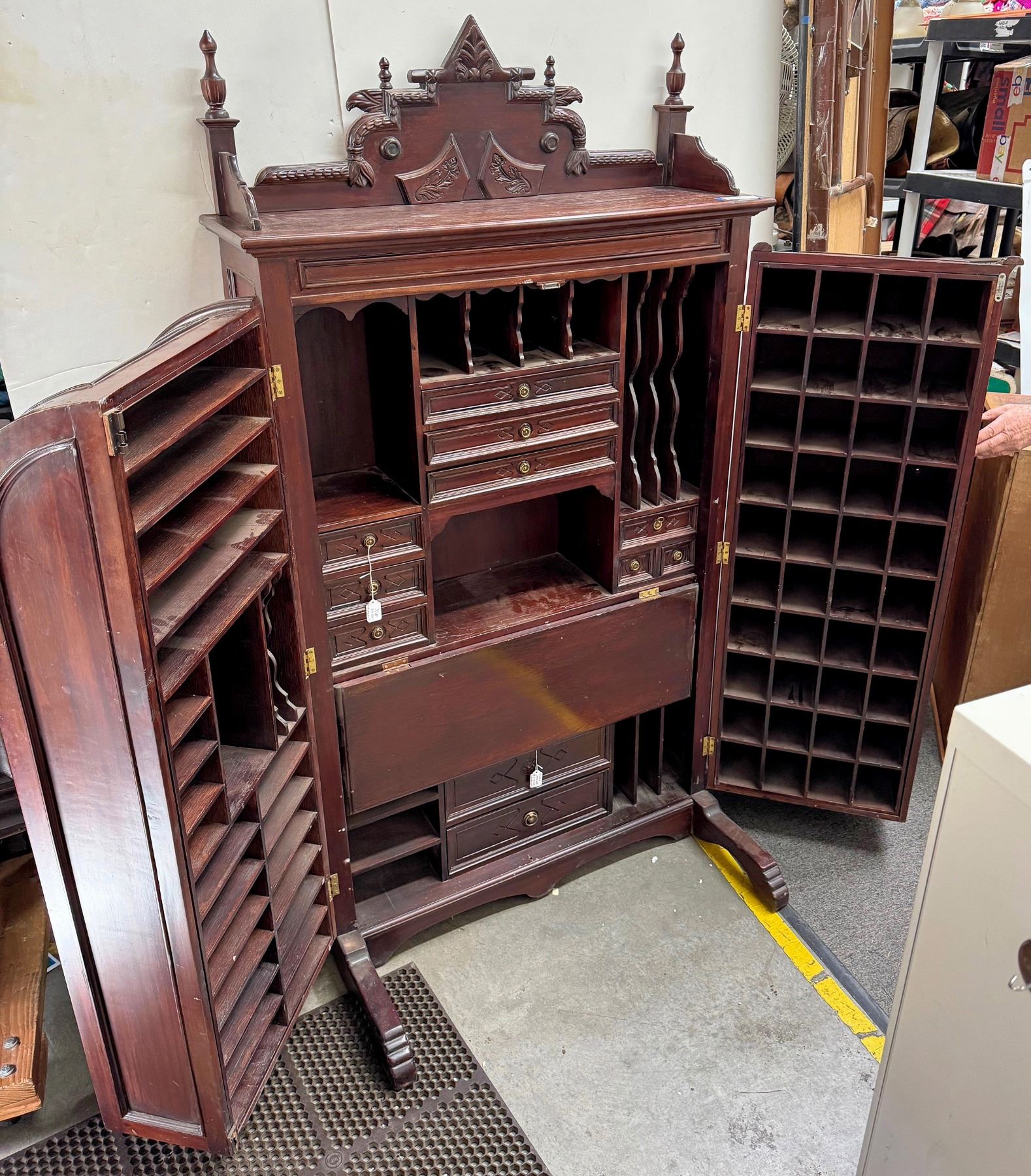 The Wooten desk is a patented design, created by William S, Wooten in 1874, and made by his establishment through 1894. The purpose was for business owners to keep correspondence and certain business papers organized and close at hand. These desks were owned by many of the great financiers, such as JP Morgan and JD Rockefeller.