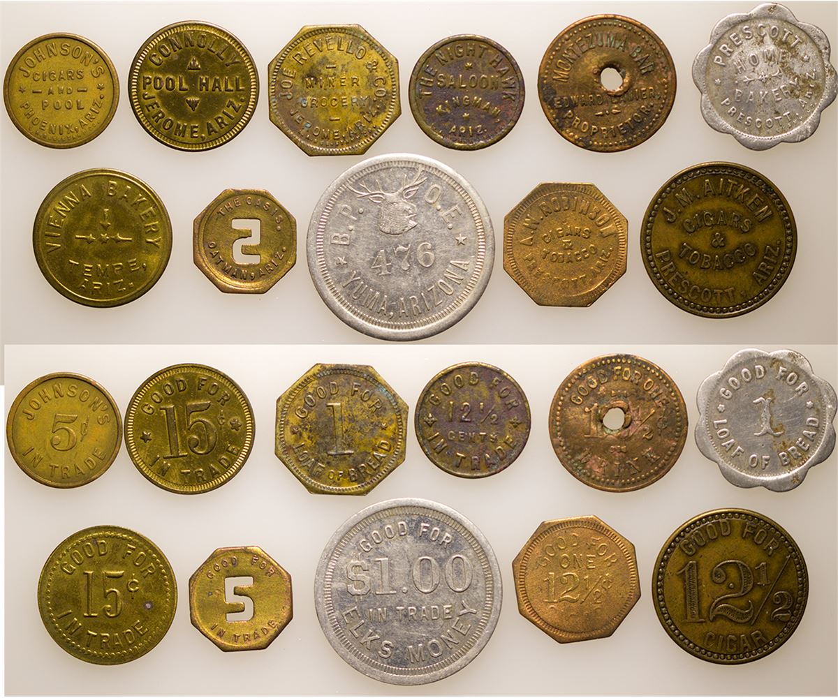 1) Jerome, AZ / Connolly Pool Hall // GF 15c IT. A seldom available token. 2) Jerome, AZ / Miner Grocery // GF One Loaf Bread. 3) Kingman, AZ / The Nighthawk Saloon // GF 12.5c IT. 4) Nogales, AZ / Montezuma Bar, Edward Lanier, Proprietor // GF 12.5 One Drink. Hole punched in token. 5) Oatman, AZ / The Oasis // GF 5c IT. "5" cut-out in token, uncommon. 6) Phoenix, AZ / Johnson's Cigar & Pool // GF 5c IT. 7) Prescott, AZ / A. W. Robinson Cigars & Tobacco //GF 12.5c One Cigar. 8) Prescott, AZ / Home Bakery // One Loaf Bread. 9) Prescott, AZ / J. M. Aitken Cigars & Tobacco // GF 12.5 One Cigar. 10) Tempe, AZ / Vienna Bakery // GF 15c IT. 11) Yuma, AZ / B. P. O. E. // GF1d IT Elks Money. Vignette of elk engraved on front.