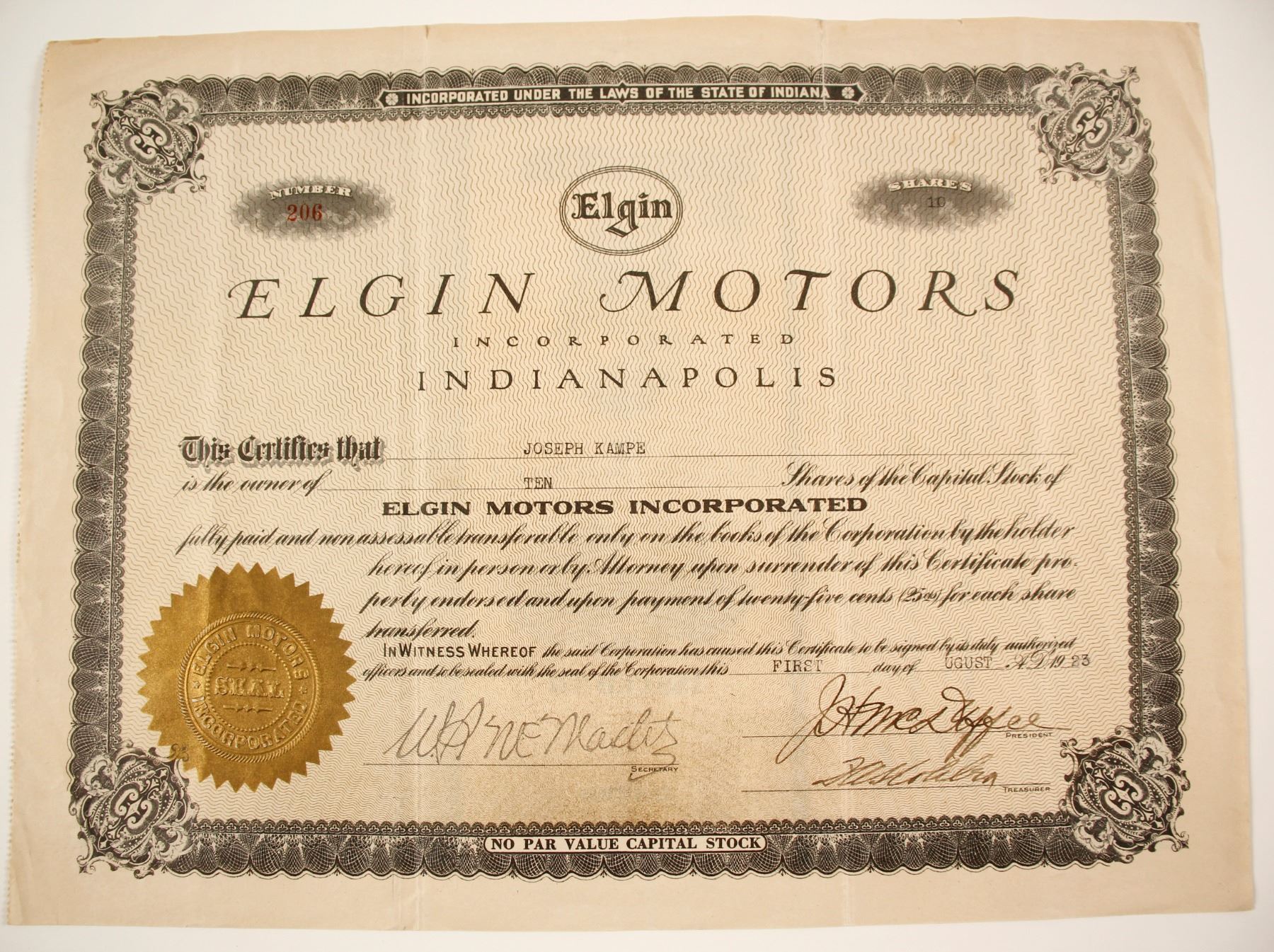 I/U# 206 Joseph Kampe 10 shares, 1923. Elgin logo. Folds and creases. City: State: Date: 1923 HWAC# 79923