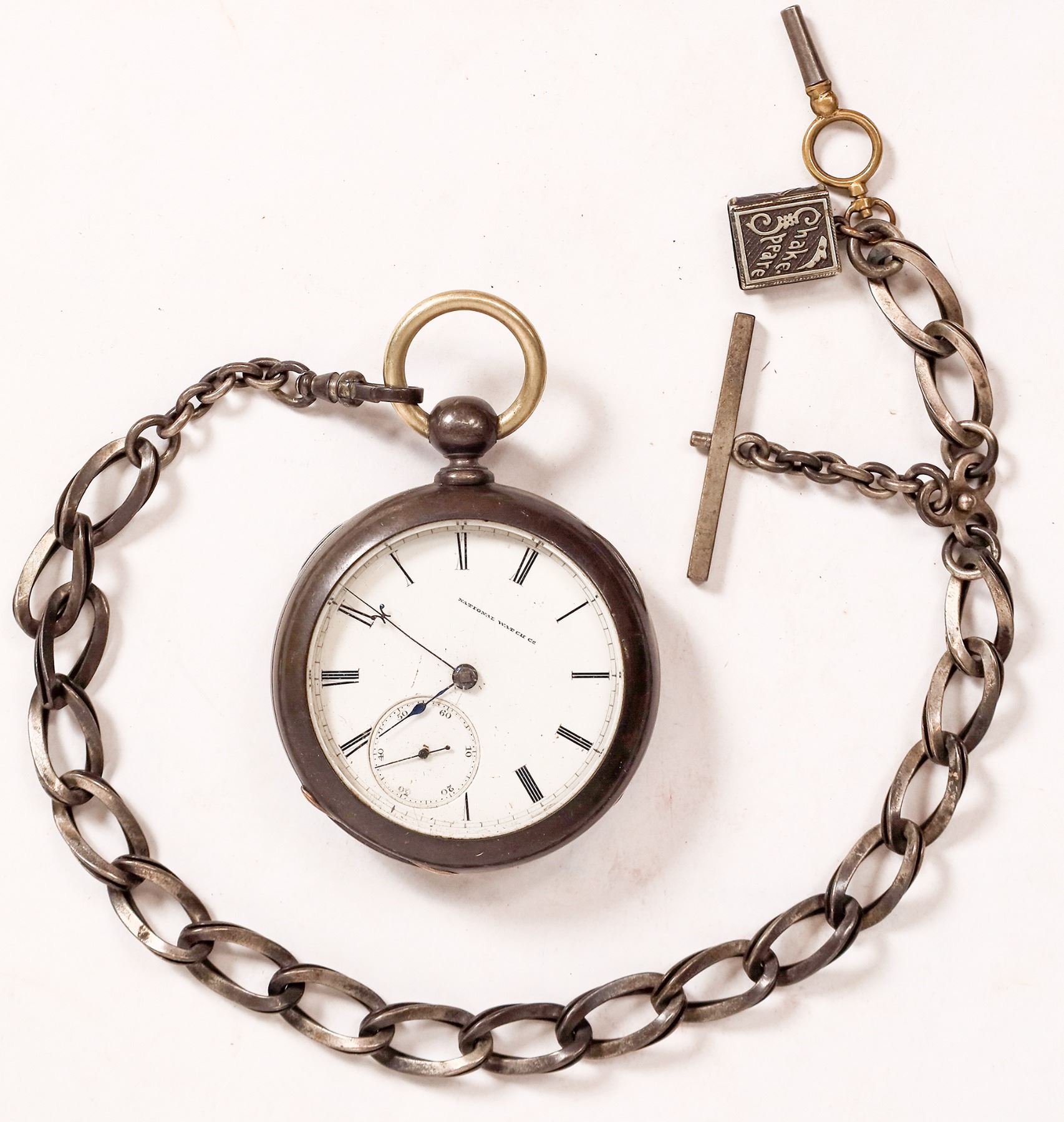 This pocket watch is an Elgin size 18s marked 5-11j key wind. Serial #112974 made in 1870. Key winder and movement works. Case is silver and is lightly inscribed by repair jewelers(?). Keychain and key of silver. Very good condition.