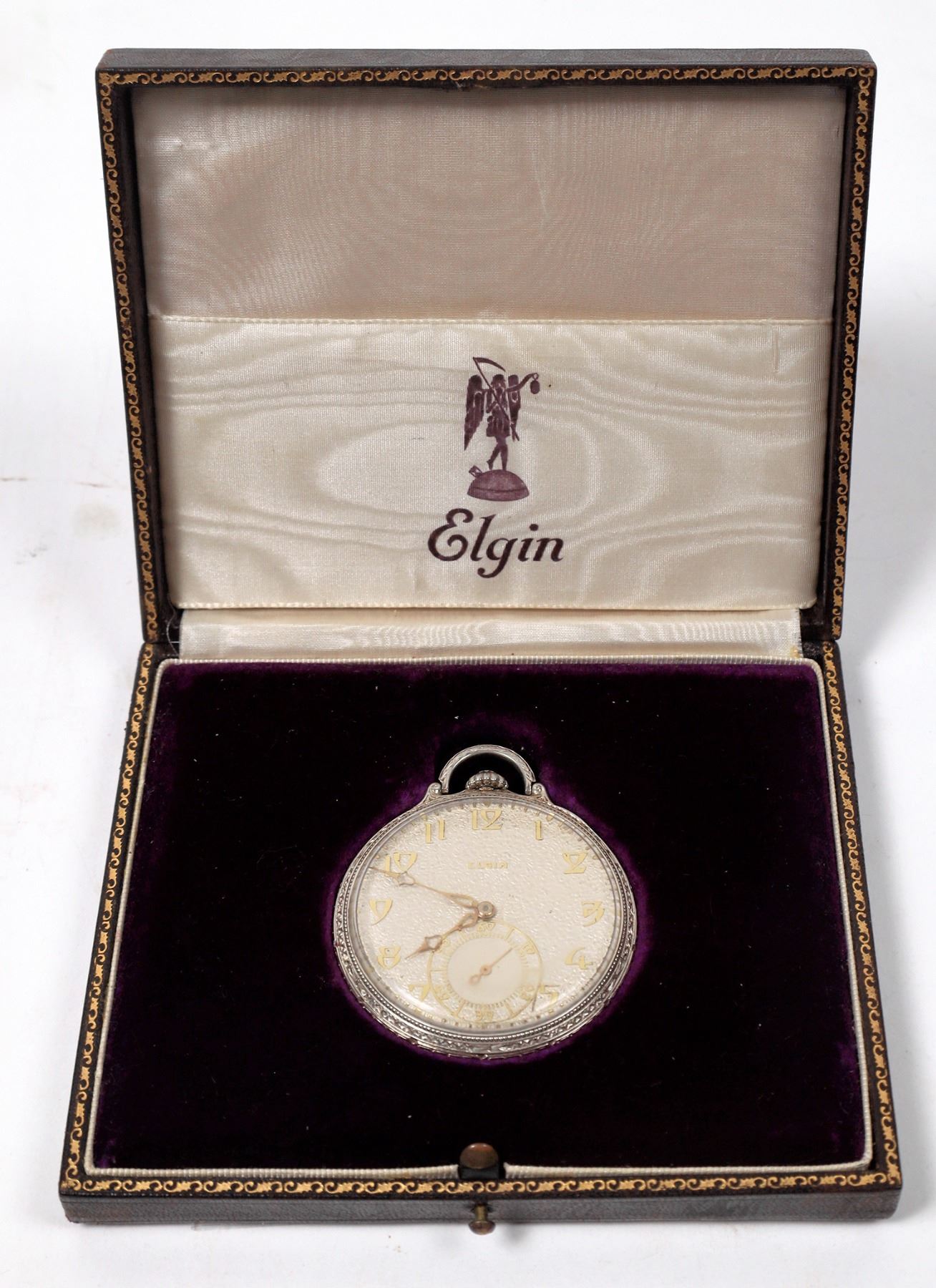 Nice Elgin 14K white gold watch in case with chain. 1.75" diameter.
