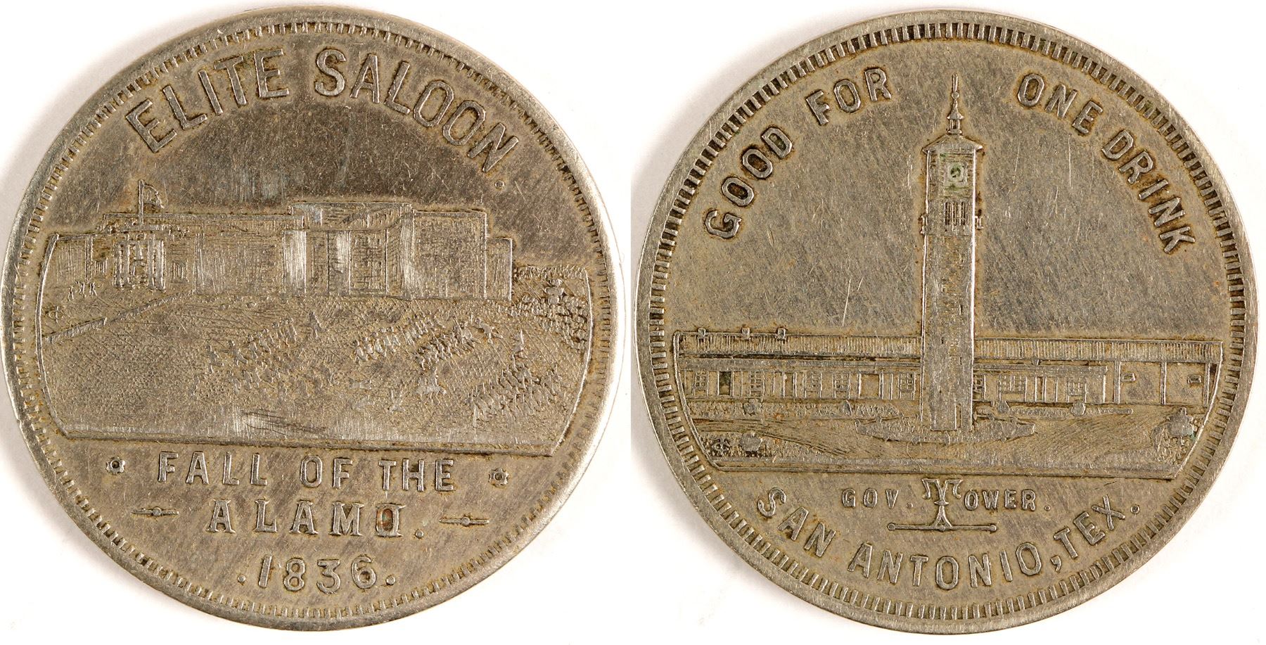 Fall of the Alamo 1836 / Good for one drink. Pictorial of Alamo on Obverse and Gov. Tower on reverse Date: Location: San Antonio, Texas HWAC# 62417