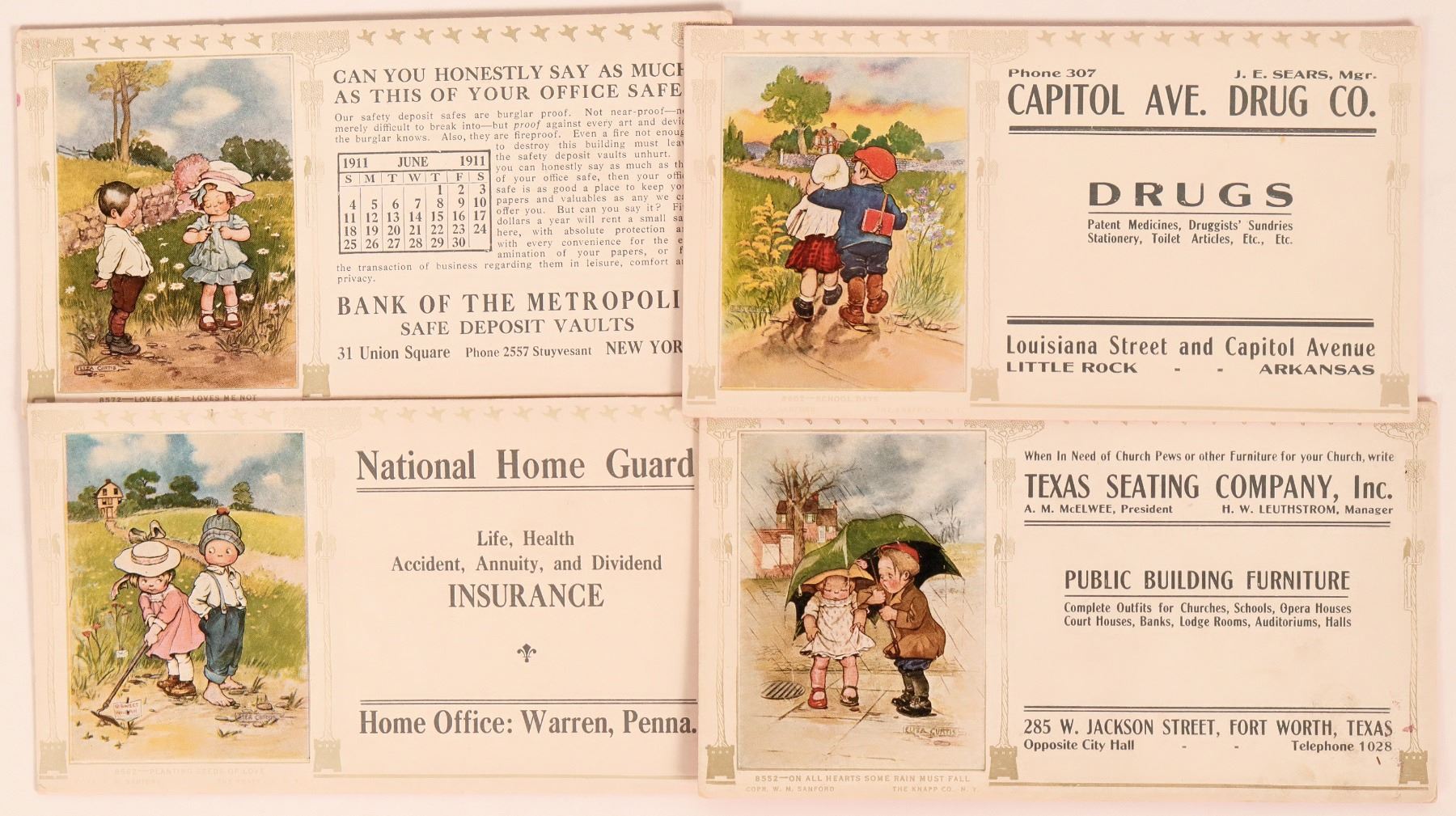 Nice grouping of advertising blotters with art signed by Eliza Curtis. The art features cute children in various states of play out in nature. The blotters are advertisements for different companies, including the Bank of Metropolis, NY, National Home Guard of P.A., Capitol Ave. Drug Co. of A.R., and Texas Seating Co., Inc. See photos for the cute artwork.