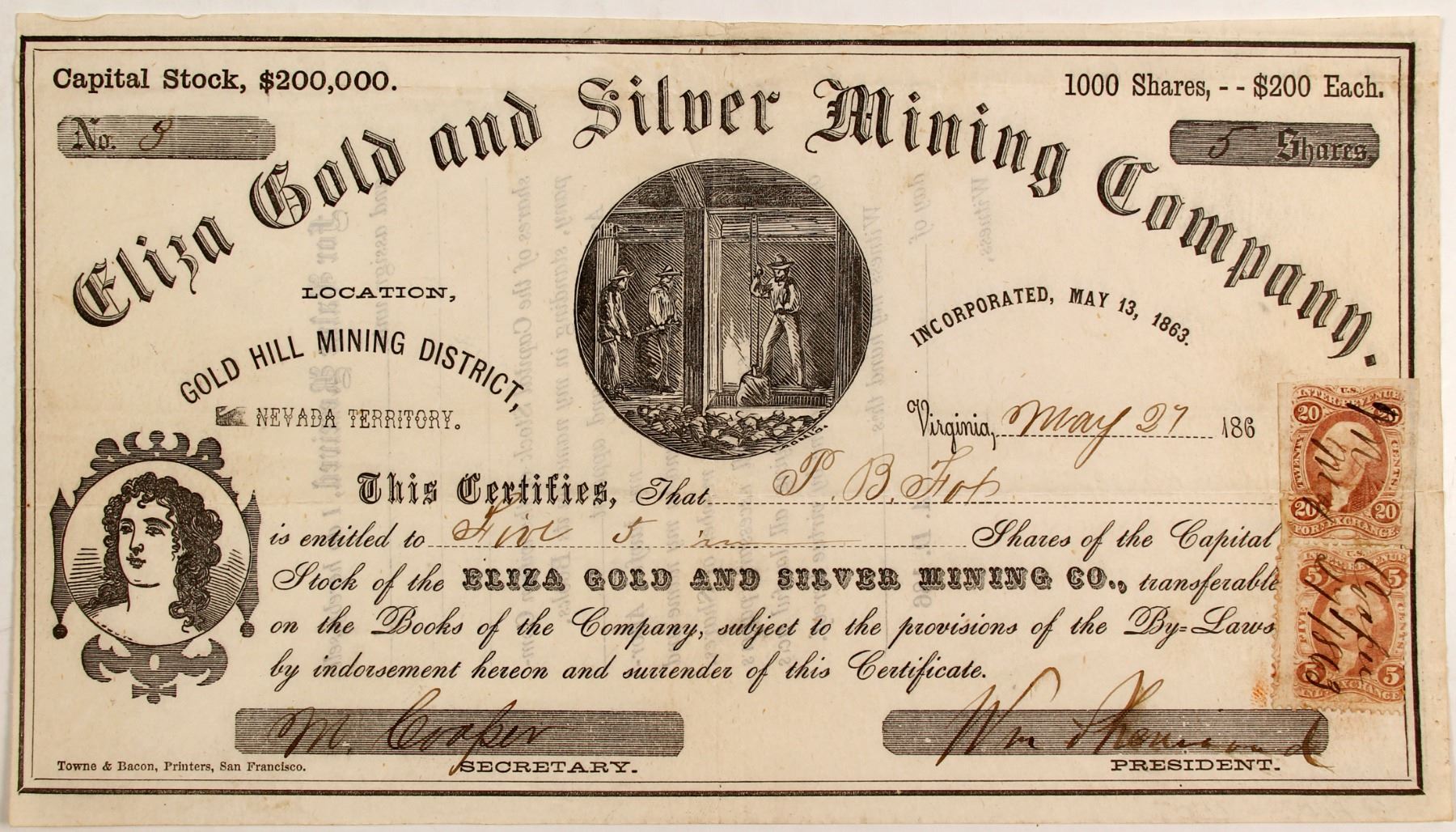 VERY EARLY NUMBER 3. For 5 shares to PB Fox. Signed by M Cooper and William (?). Dateline May 27, 1863. Incorporated May 13, 1863. Location: Gold Hill Mining District, Nevada Territory. Not cancelled. 20c and 5c small revenue stamps. Unusual Loomis vignette of underground mining. Also lady's (Eliza?) image. Towne & Bacon porinter. No corner, edge, pinhole, or discoloration issues. Very Fine! Not listed in Collins. Prag Collection. State: Nevada City: Gold Hill Mining District Date: 1863 HWAC# 84519
