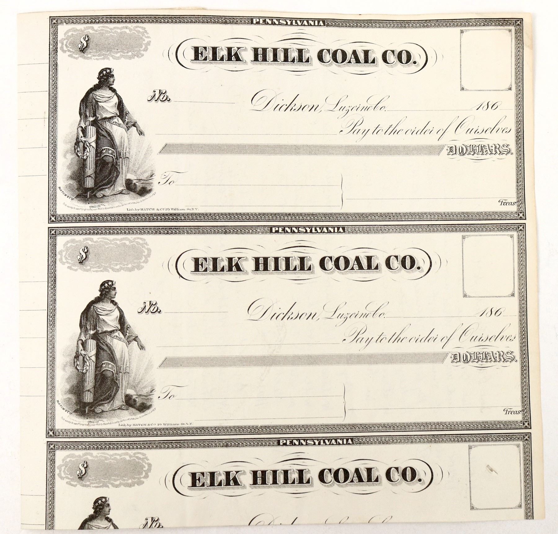 Rare unissued 1860's, 2 stocks plus a partial, Elk Hill Coal. Unrelated writing on verso, see photo.