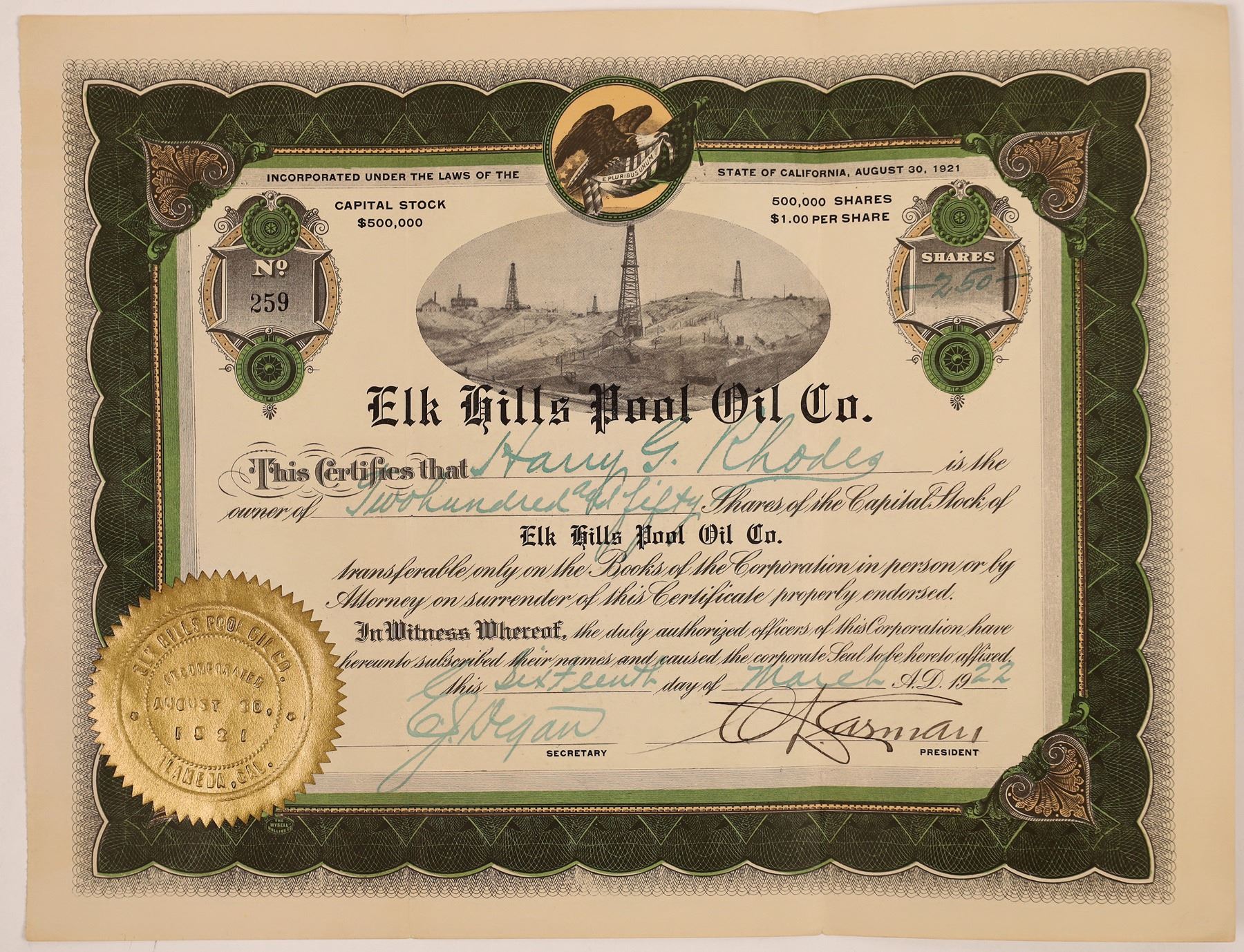 A famous California oil locale. Inc. in California, 1921. No. 259, issued for 250 shares to Harry Rhodes on March 16th, 1922. Signed by president Carman and secretary Degan. Not cancelled. Green and gold border, gold seal, and photo vignette of the Elk Hills oil field. Deep folds, some toning. 9 x 11.5" The Elk Hills Oil Field is located in Kern County and was discovered in 1911.