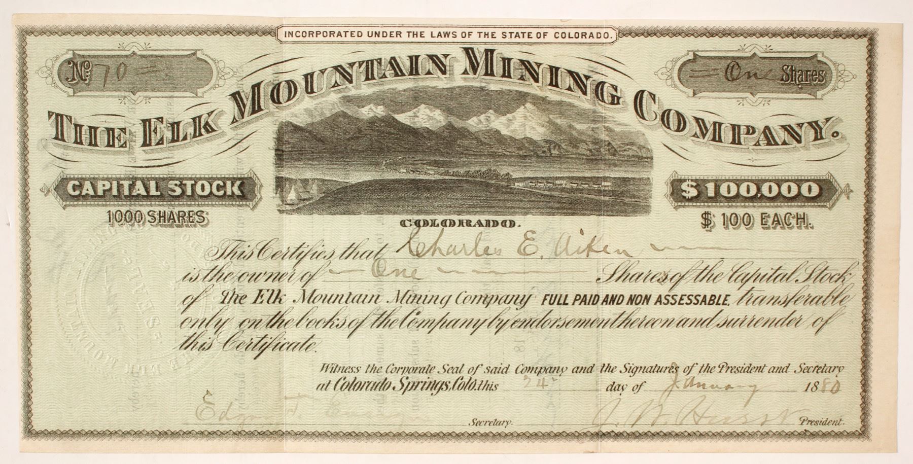 # 70 for 1 share to Charles Aiken. Signed by Edgar T (?) and president JM Hurst. Dateline Colorado Springs 1880. Interesting Mountainous vignette (it sure looks like Elk Mountain!) in the Rockies with horse drawn ore wagons. Not cancelled. No corner, edge, discoloration or pinhole issues. "Contractors on the property of the Elk Mountain Mining Company owners of a large group of claims near Cement Creek have been pushing the cross cut into the mountain Several veins have already been cut but the tunnel will be driven to its objective point said to be about 2,000 feet ahead." [Biennial Report Issued by the Bureau of Mines of the State of Colorado, 1916] Prag Collection State: Colorado City: Colorado Springs Date: 1880 HWAC# 85237
