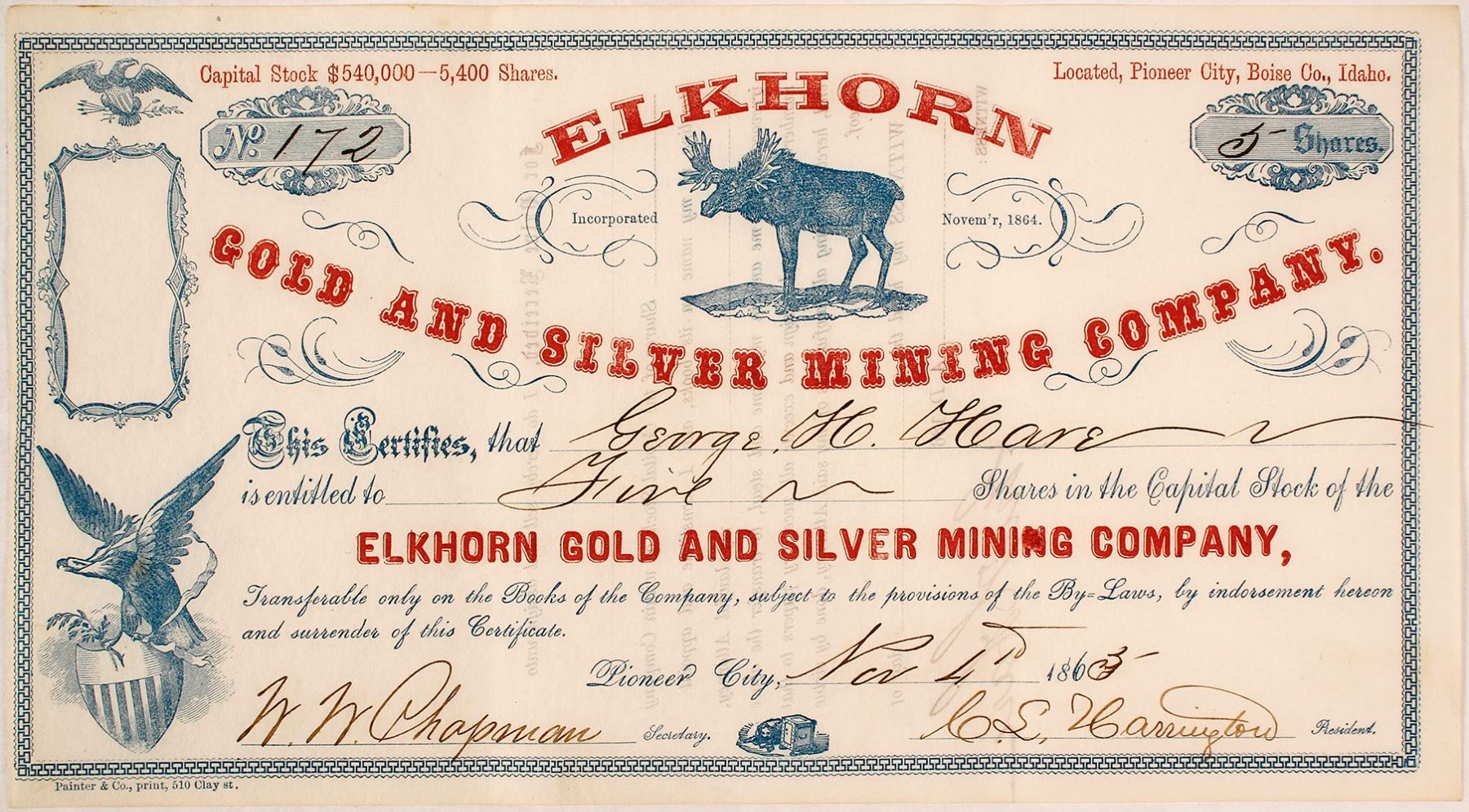 Issued during the Boise Basin Gold Rush! Gorgeous and ultra rare certificate. Inc. Nov. 1864. Location printed at the top: Pioneer City, Boise Co., Idaho. No. 172, issued for 5 shares to George H. Hare on Nov. 4th, 1865 in Pioneer City. Signed by the president C.S. Harrington and secretary W.W. Chapman. Not cancelled. Red and blue print on white paper. Vignette of moose (not elk) (top center) and eagle with shield (bottom left). Printed by Painter & Co. Very fine condition. 5.5 x 10" One of the pioneering mining companies in the Boise Basin. Discovered initially by placer miners, the association of gold with quartz led to discoveries of lode deposits in veins along Granite Creek. The better classes of rocks assayed between $6,000 and $20,00 to the ton. [Ref: Bancroft, p 415] (Al Adams Gold Rush Memorabilia Collection) Date: Location: Pioneer City, Idaho HWAC# 58448