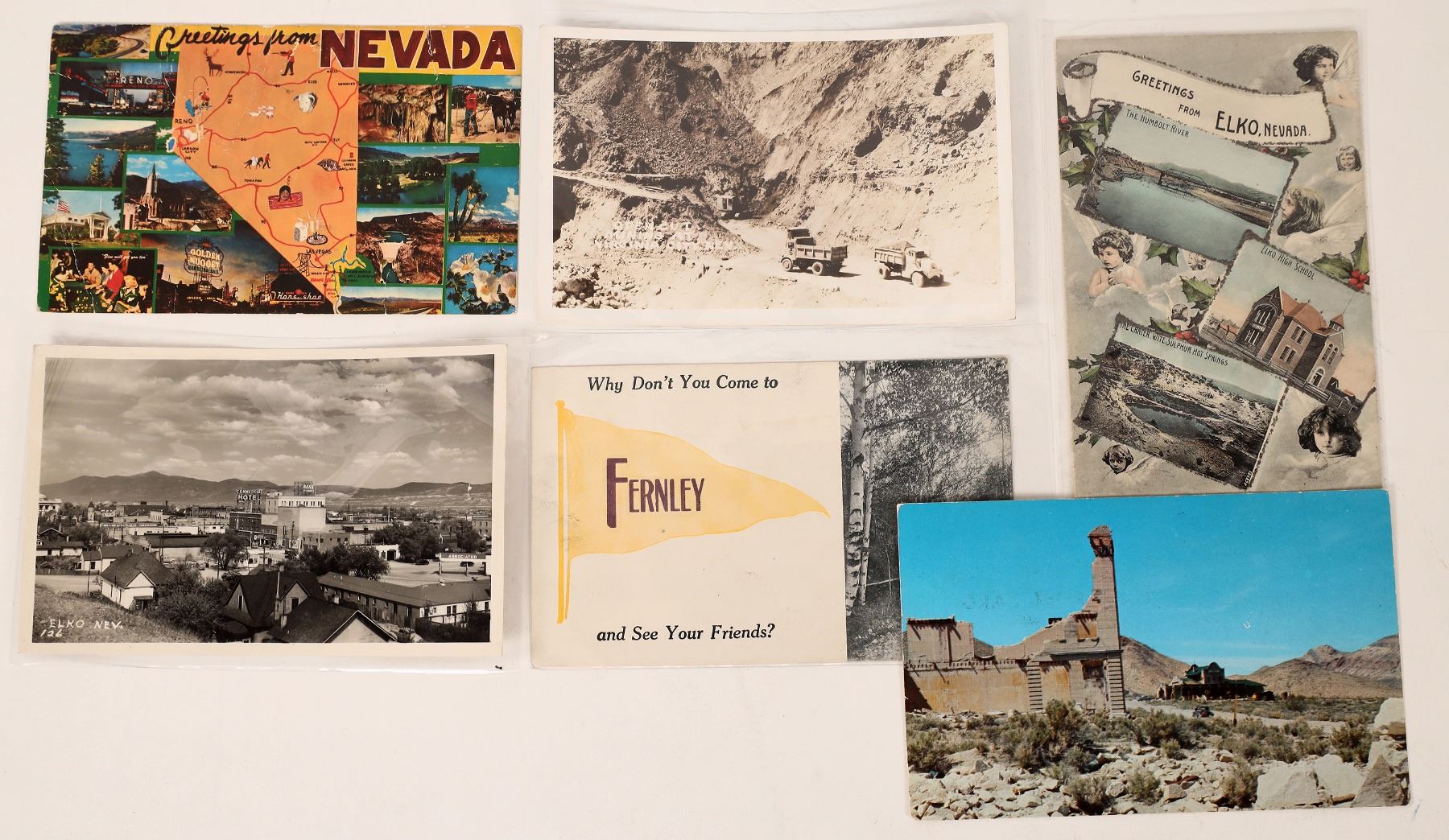 Lot of 5. One RPPC of open pit mine Virginia City NEv. cir 1950's. One greetings form Nev. w/map. one greetings from Elko embossed card. Fernley invite cards,postmark Fernley 1910. Rhyolite Nev. color post card. Nevada 1910-50's Ken Prag Collection