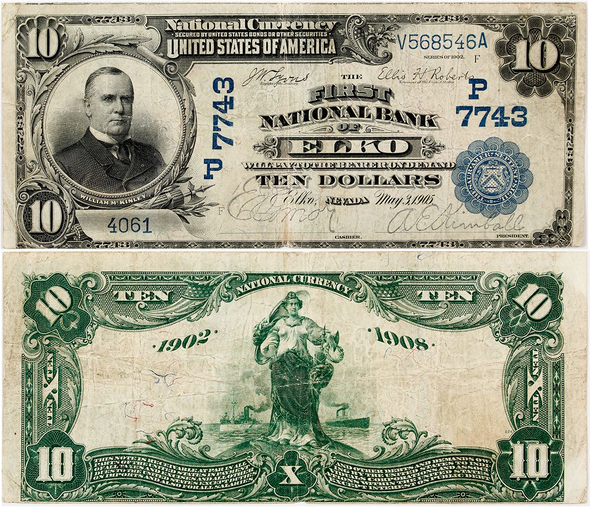 The second 1902 Date Back in the census and the first to bear rubber stamped signatures of E.E. Ennor, cashier and A.E. Kimball, president. Condition: Fine Serial Number: 4061 Elko Nevada HWAC# 32204