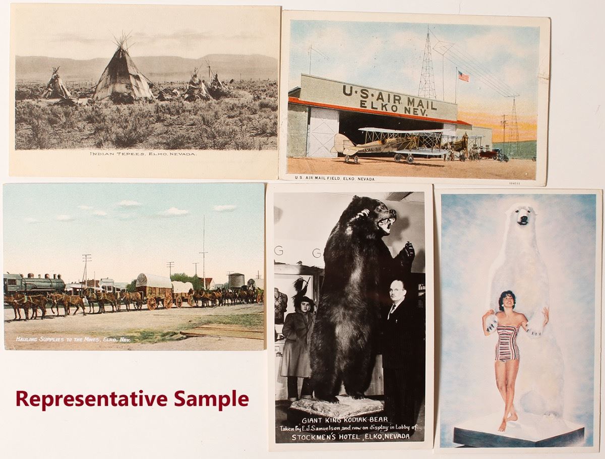 Wide variety of subject matter from buildings, to polar bears, to the air mail airport, to Native Americans, to wagons hauling supplies, to birds eye view, to White Sulpher Hot Springs, to gambling, to hotels, etc. Lot of 38. Some duplicates. City: Elko State: Nevada Date: ID# 44054