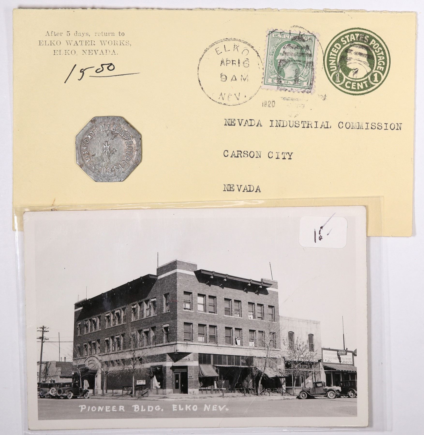 Three old items from Elko: 1) Pioneer Building real photo postcard, unwritten, undivided back, circa 1910; 2) token: Mason Products Co. / Elko, Nevada // Good For / 10c / On Return / Of Bottle; Al, octagonal, 27 mm; 3) postal cover from the Elko Water Works to the Nevada Industrial Commission, postmarked 1920. (Items used in Holabird's Bottle Book)