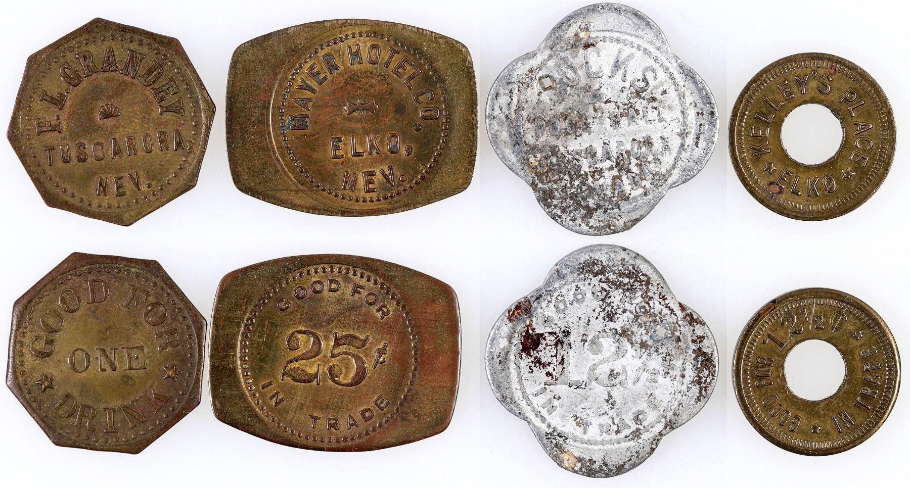 Lot of four Nevada tokens. 1) KELLEY'S PLACE / ELKO // GOOD FOR 12.5¢ / IN TRADE (center hole); Br, rd., 21 mm. 2) MAYER HOTEL CO. / ELKO, / NEV. // GOOD FOR / 25¢ / IN TRADE; Br., barrel shape (33 x 25 mm). 3) BUCKS / POOL HALL / TUSCARORA / NEVADA // GOOD FOR / 12.5¢ / IN TRADE; Al., Sc4, 30 mm. 4) F.L. GRANDEY / TUSCARORA, / NEV. // GOOD FOR / ONE / DRINK: Br., octagonal, 25 mm.