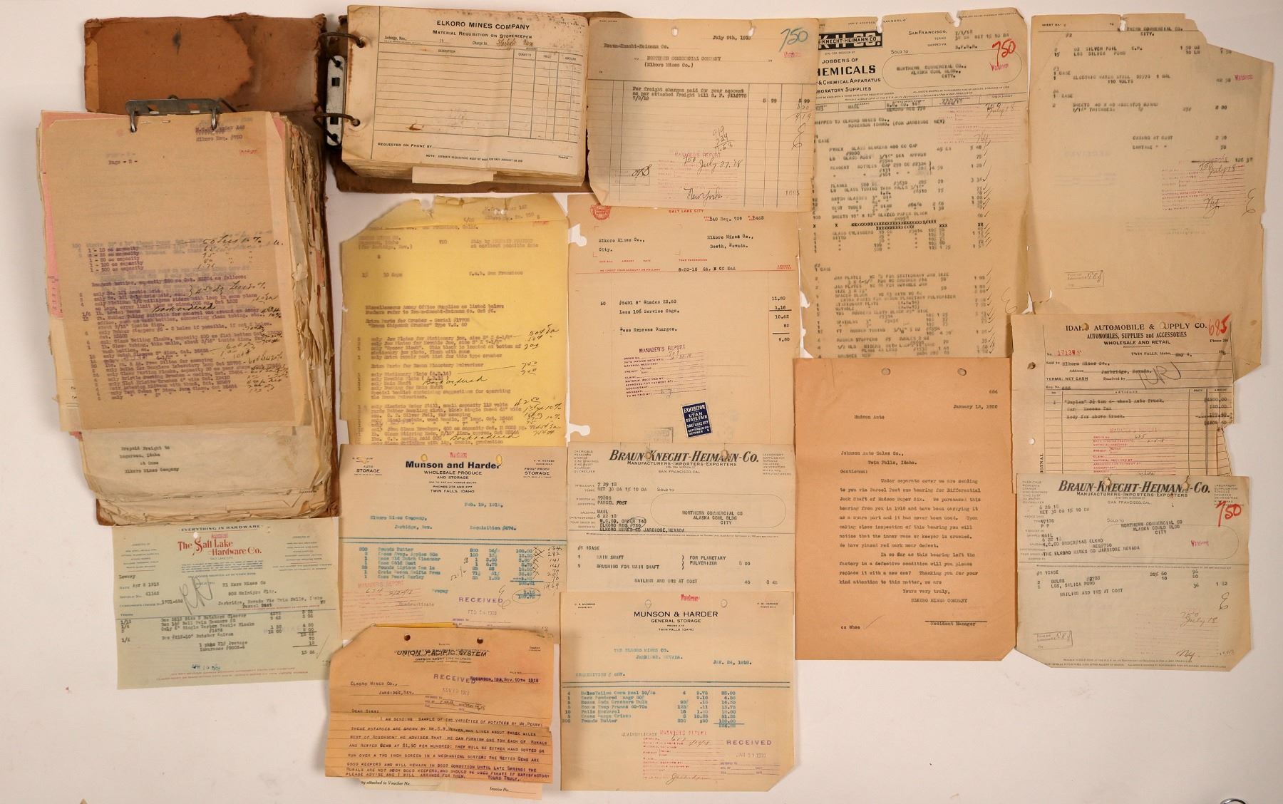 Group of records from the Elkoro Mines in Jarbidge. c1918-1921. Approximately 300+ Material Requisition forms from 1918-1921 for virtually every part of the mining operation, including assay office and mine headquarters. Another set of perhaps 700+ records of purchases over the same approximate dates. This large group includes correspondence, invoices. Elkoro was owned by the Northern Commercial Co., formerly the Alaska Commercial Co., which ran stores throughout Alaska, especially the mining regions. The lot includes two old blueprint copies of a town map of Jarbidge, 1920