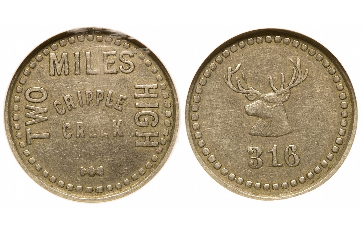 Obv.: Two Miles High / Cripple / Creek; Rev.: (Elk pictorial)/ 316; NGC XF40.