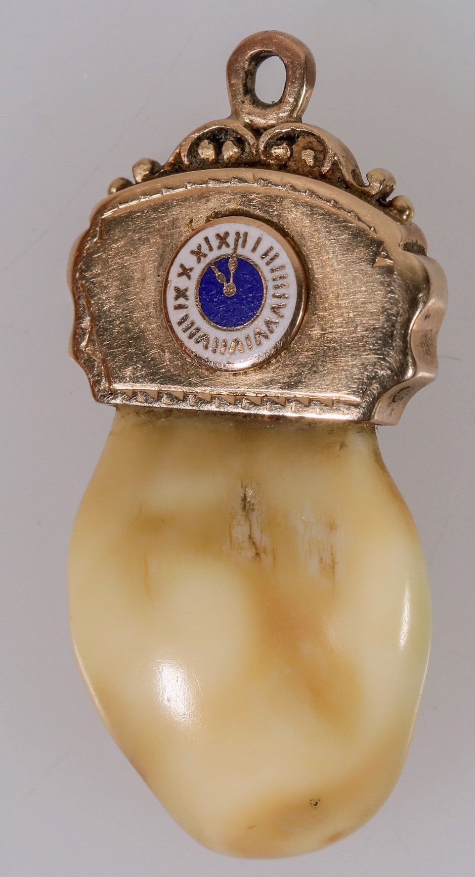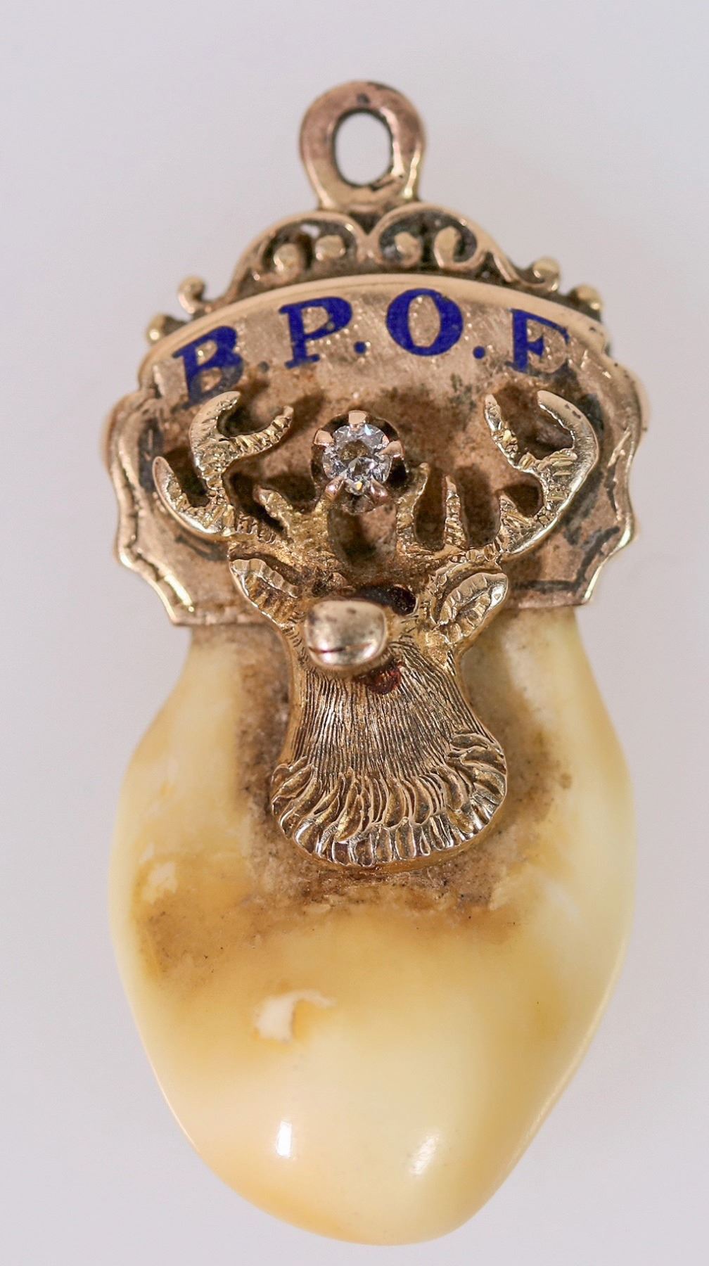 Benevolent Protective Order of Elks gold piece (9.4 grams total weight) with elks head and a small diamond, holding an elk's tooth. 40 x 20 mm.