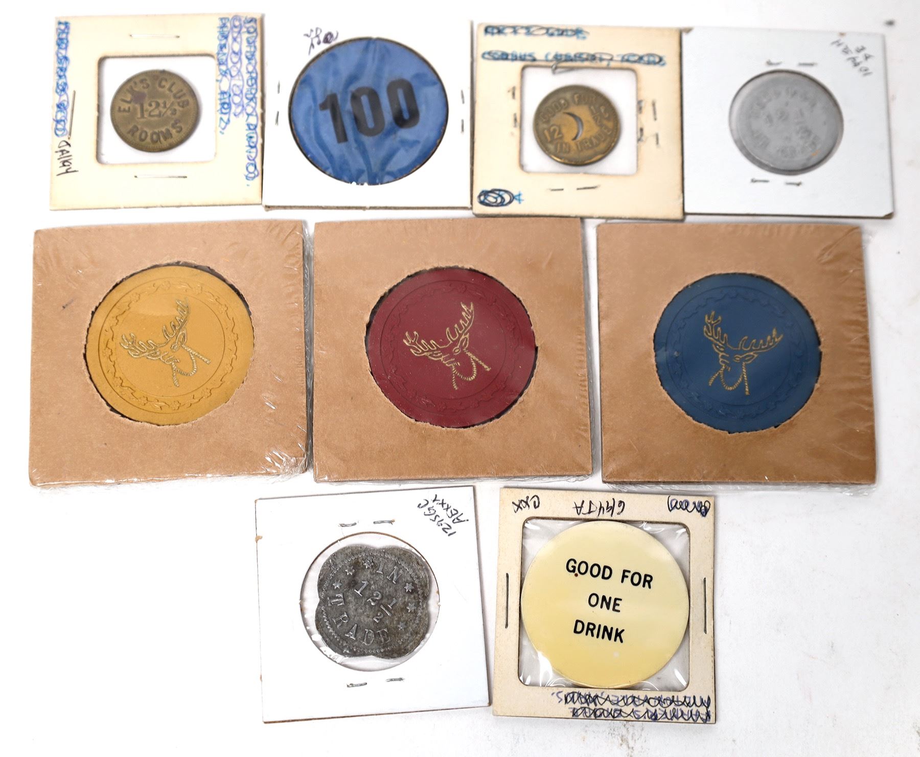 Lot of nine tokens from Leadville: five are poker chip from B.P.O.E. lodge 236; three different from the Elks Opera House Bar, and one from The Kolsch Pharmacy / Elk's Club Rooms.