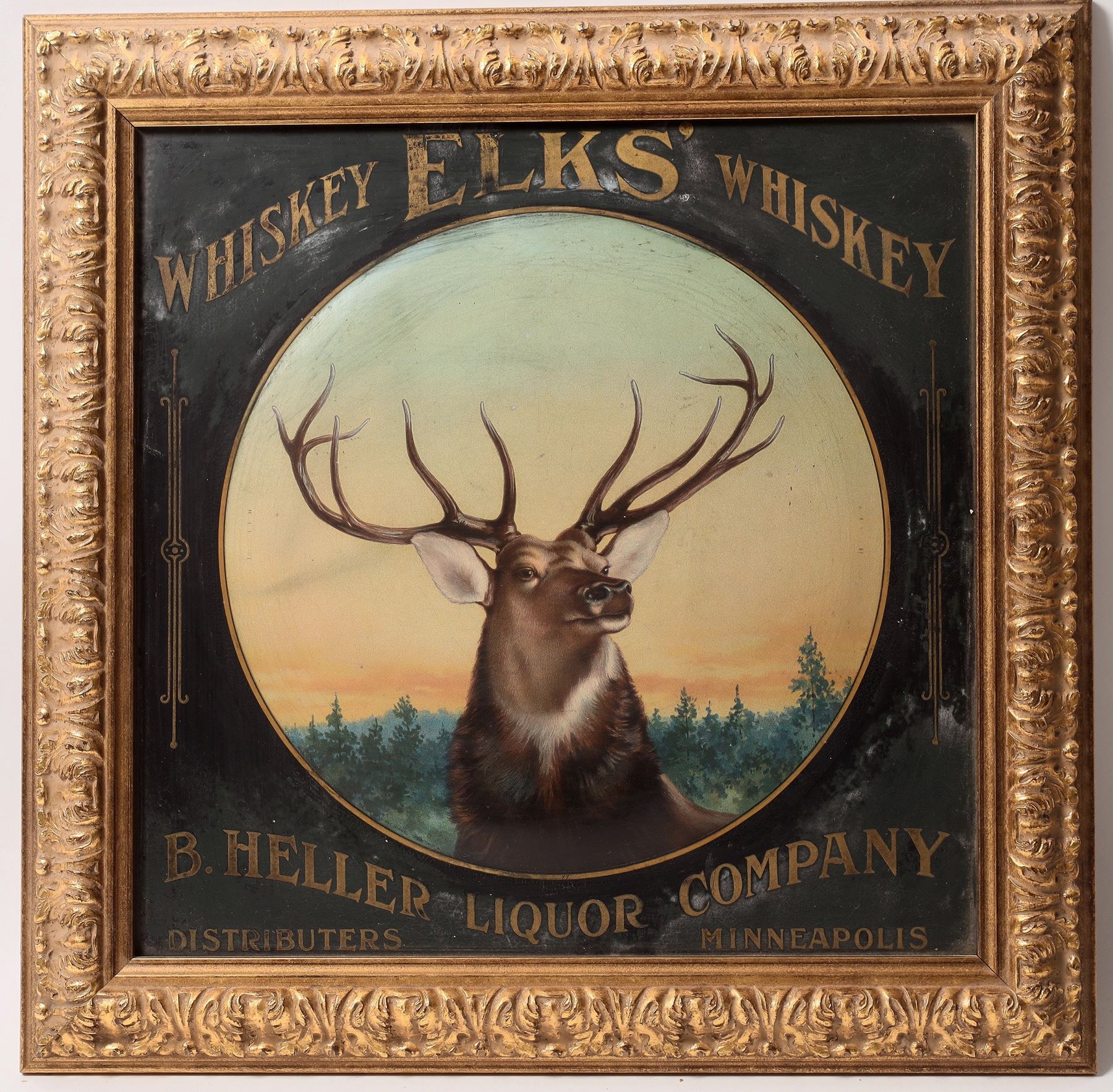 c1901-1902. This is an original whiskey sign from the Bovis private Tombstone Museum. It is a marvelous piece of whiskey advertising. Ornately framed 18 x 18" with the sign itself perhaps 14 x 14" "Whiskey Elks Whiskey // B.Heller Liquor Company/Distributers Minneapolis" The center has a beautiful painting of an elk in a mountain forest setting. Please see the photo, some minor moisture discoloring of the black background. Otherwise generally fine though not excellent. This is a fine addition to any whiskey or saloon collection! Shot glasses are also known from this company. City: State: Date: