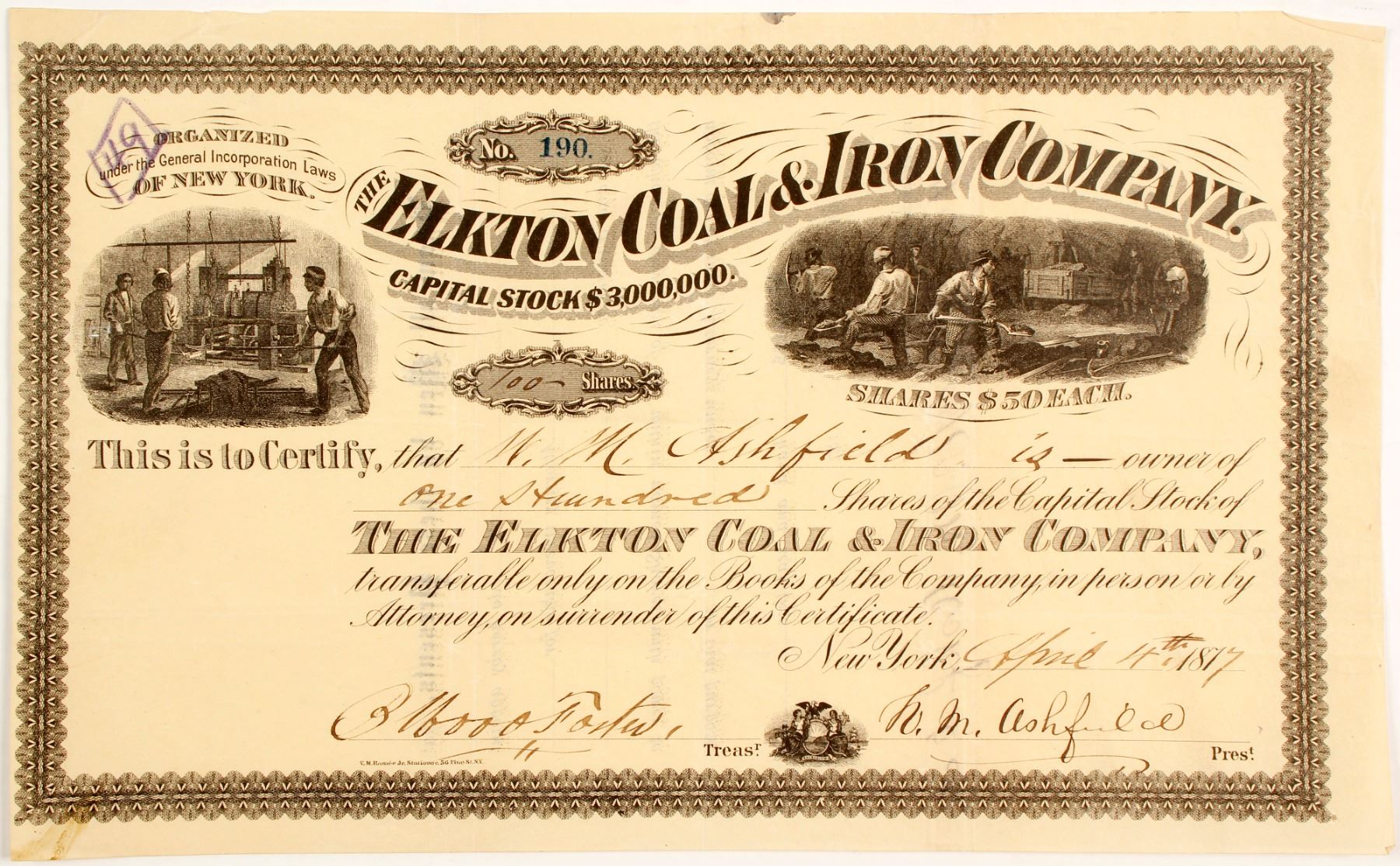 # 190 for 100 shares at $50 a share. To WM Ashfield. Signed by Foster and president Ashfield. dateline 1877 New York. Organized and incorporated in New York. Purple '49' handwritten in box top left. Two small holes upper left, dog ears. Small black discoloration top center. Otherwise very nice. Underground mining and smelting vignettes. VM Ranee printer. Not cancelled. This company owned 2,700 acres of coal land at Elk River, Kanawha County, West Virginia. Prag Collection State: West Virginia City: Elk River Date: 1877 HWAC# 81919