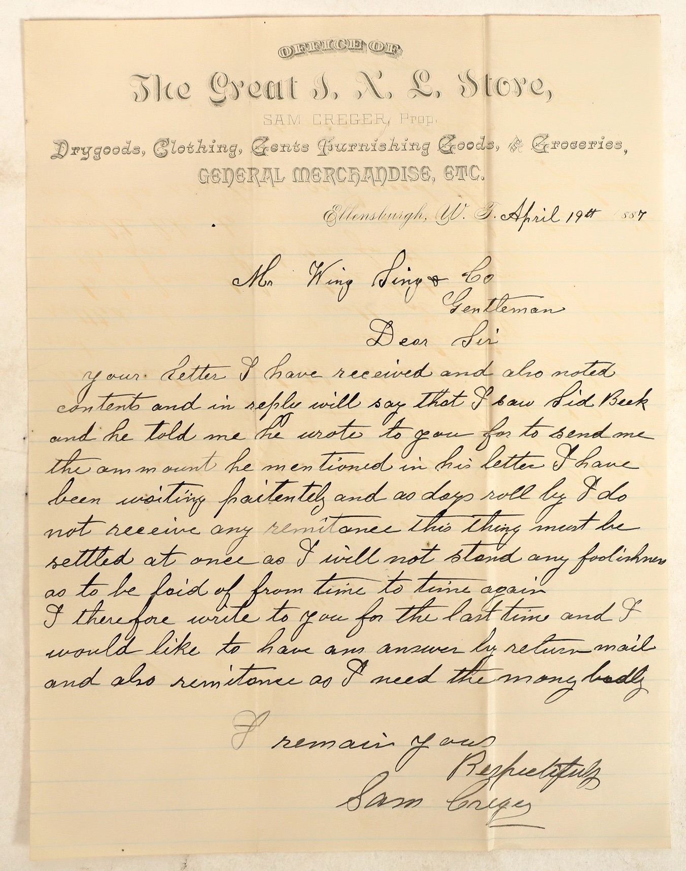 Postal cover and letter dated 1887 From Sam Greger The Wing Sings & Co. A letter of complaint regarding monies owed and demanding answers as to why funds have not been received. Letter and cover are very good condition. Post office operated from 1873-94.