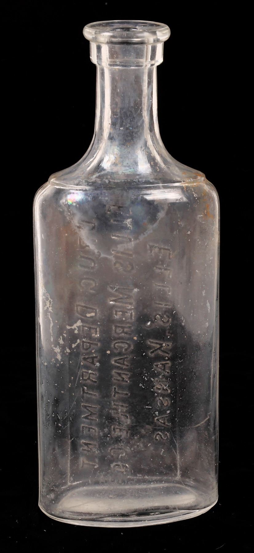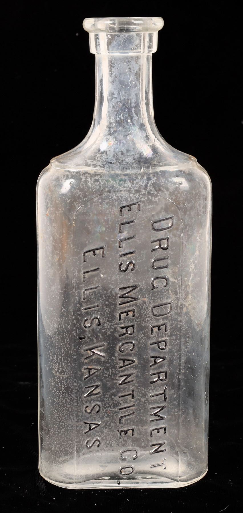 Black embossed medicine bottle, Ellis Mercantile Co. 7.25", base ding. No apparent chips or cracks.