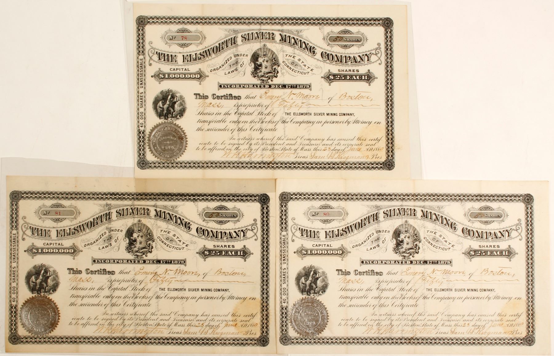 Three stocks: numbers 78, 80, 81. Allissed to Emery N Moore of Boston for 50 shares. Signed by WH Harrington treasurer and Sam B Krogman president. Incorporated in Connecticut. Overall in very nice condition. Two vertical folds. Staining where seal was pressed against other side of the stock. 8 in. X 12 1/2 in. Ellsworth was located near the Blue Hill copper district. Maine's Silver Rush that took place 1878-1882. Silver (in galena) was first discovered in Sullivan, Maine in 1877. Speculation about the richness of the claims was fueled by the publication of the Maine Mining Journal in 1880