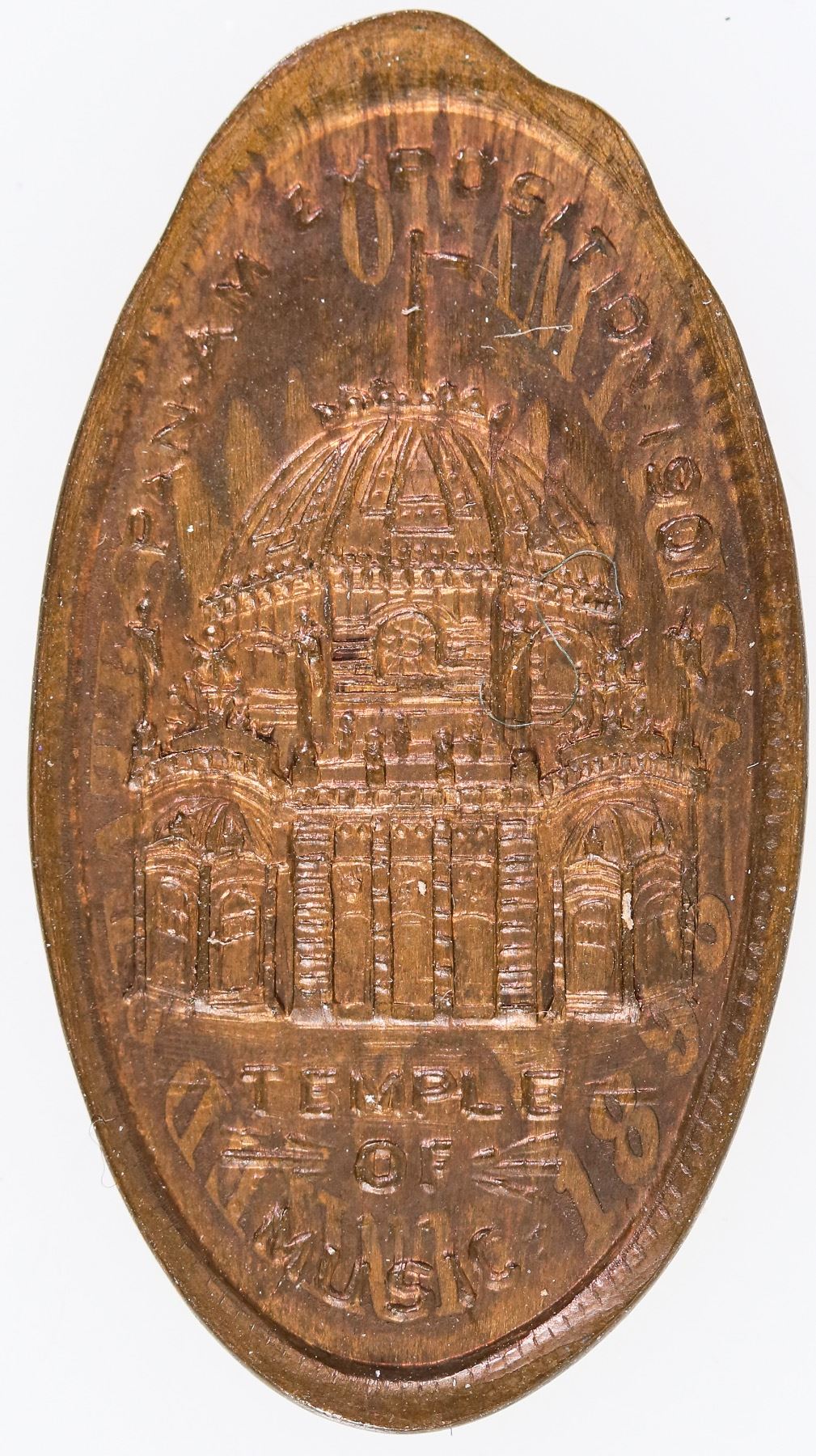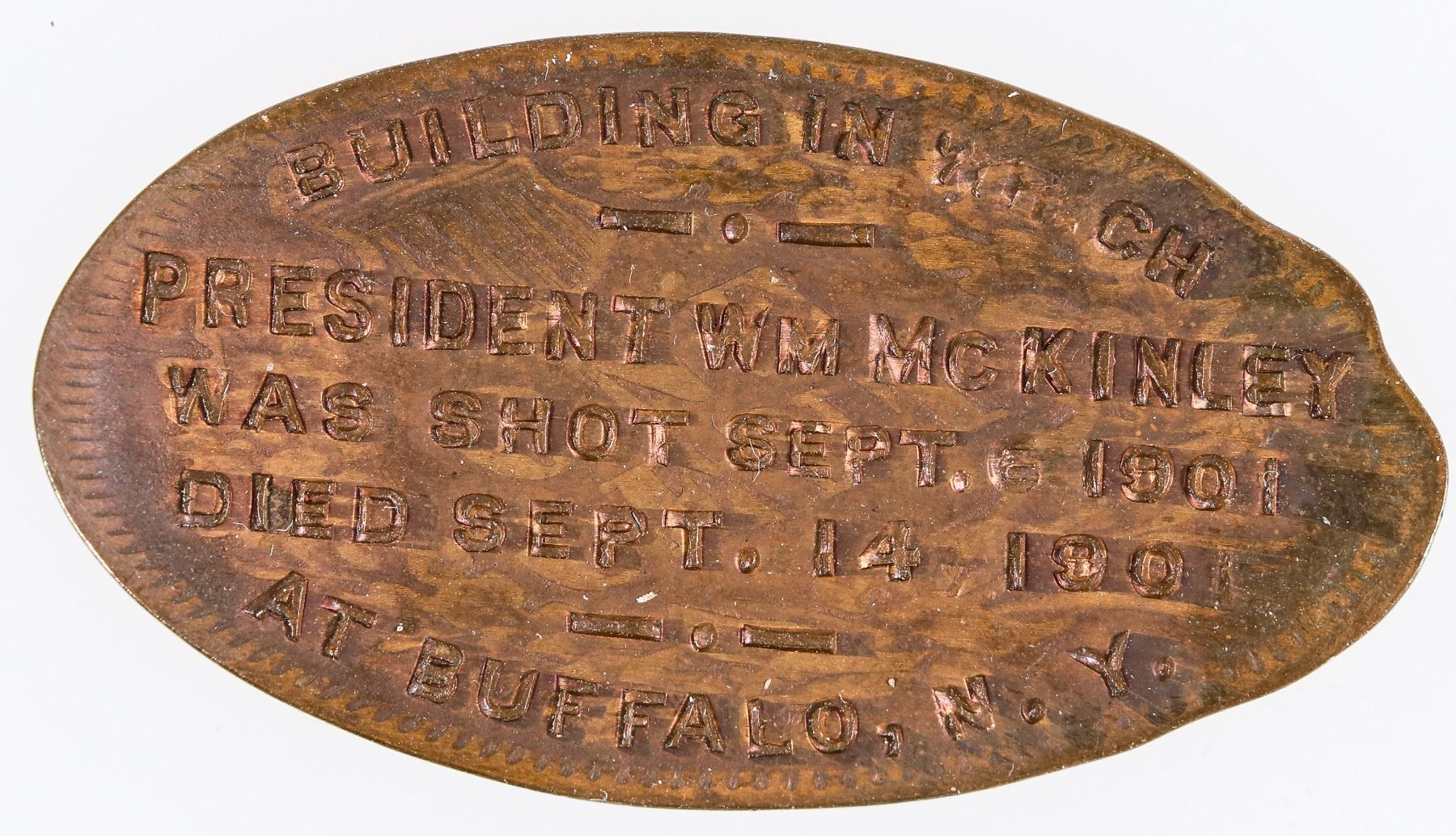 A group of eleven "squished pennies" as souvenirs from places like the Wisconsin Dells, the Lewis & Clark Expo, the Jamestown Expo, Roaring Camp, CA, and commemorating people like George Washington and Will Rogers.