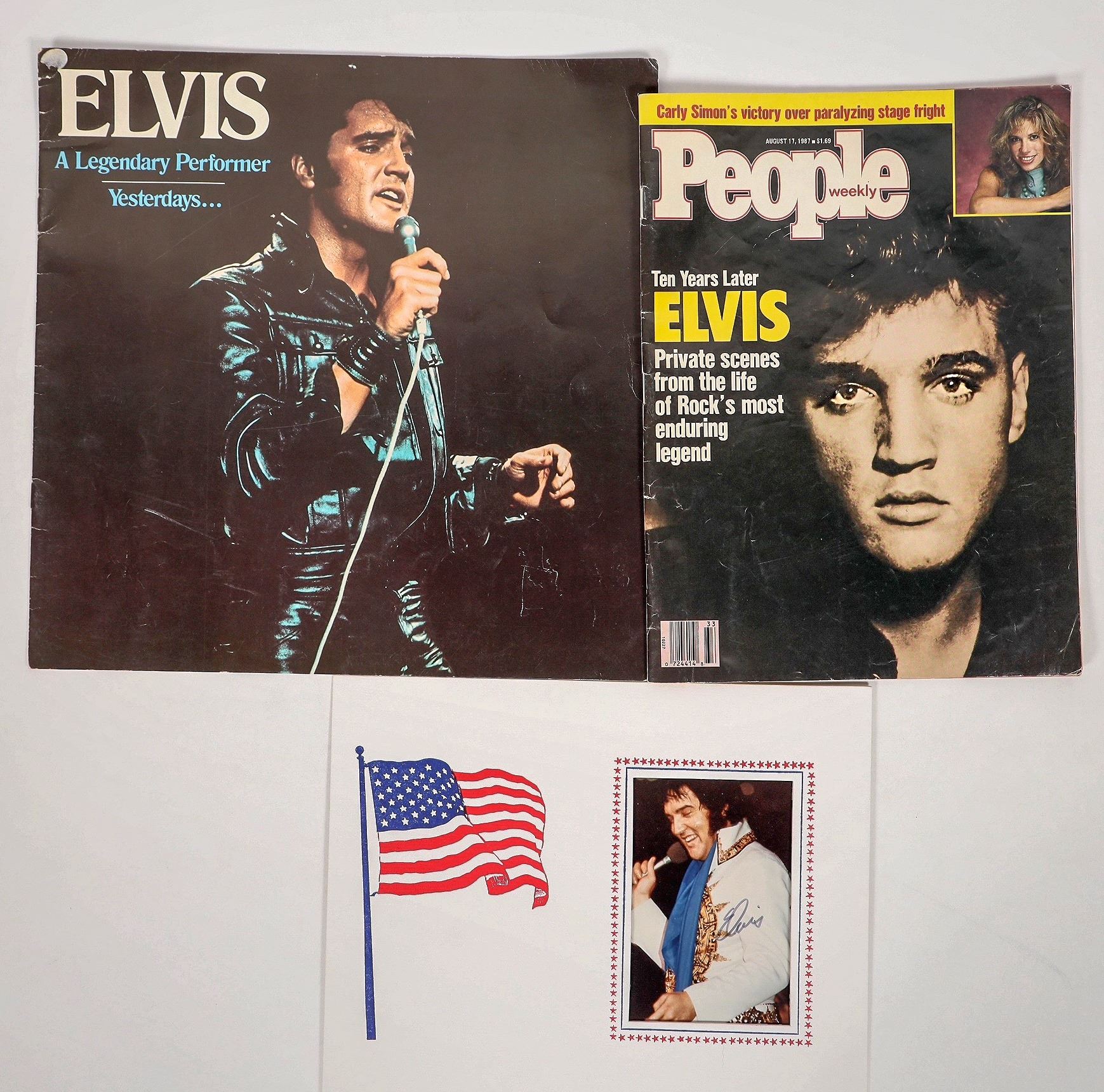 An Elvis Presley package, featuring the August 1987 People Magazine and its article on Presley, 10 years after his passing. Also included is a pictorial program entitled Elvis: The Legendary Performer, Yesterdays.... and last, but certainly not least, mounted 3"x 5" autographed color photo of "The King". He signed "Elvis" and the signature checks out. Please see photos for more details.