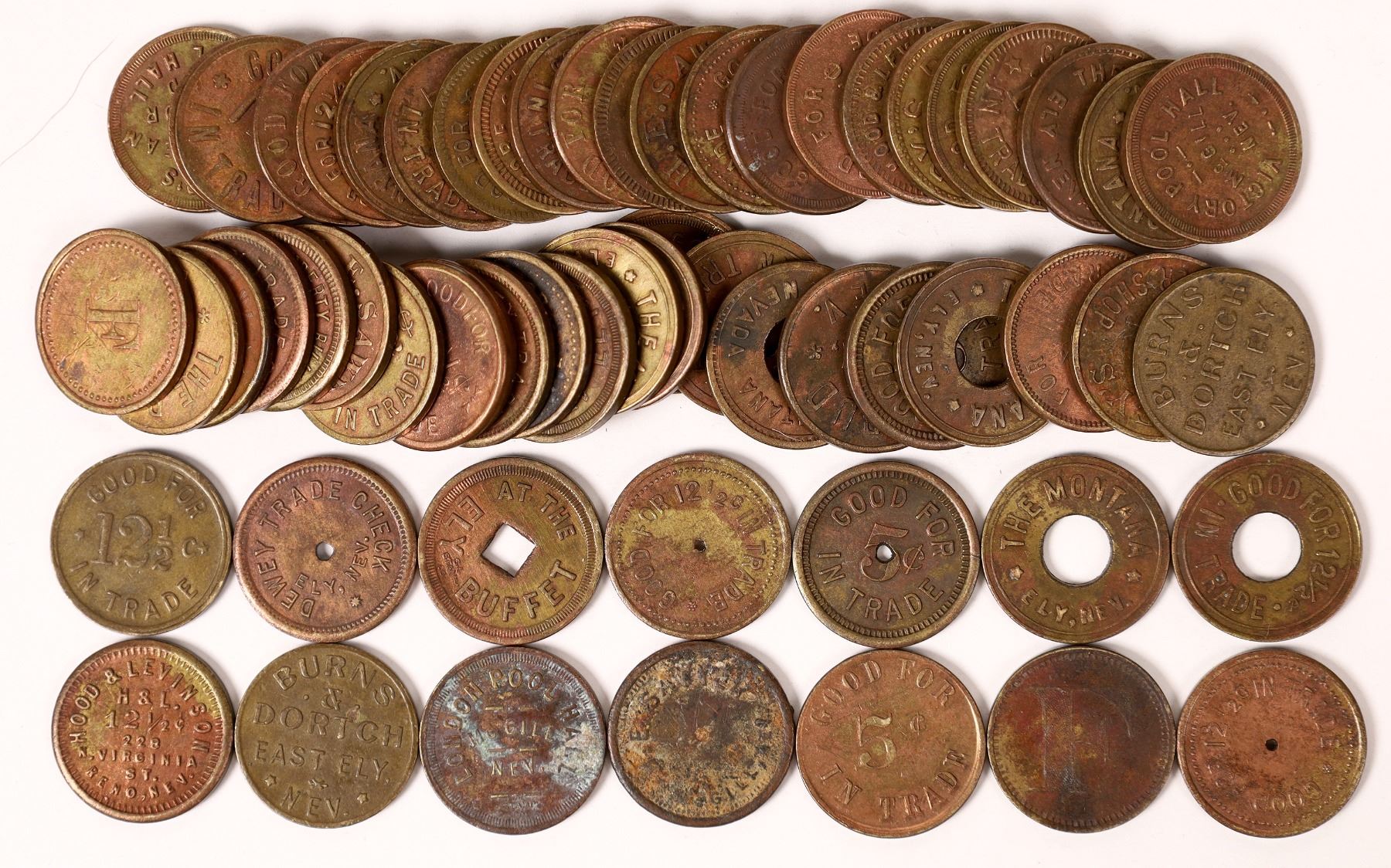 Lot of 60 trade tokens from the Ely Nevada area. Liberty Billiard Hall, McGill; Dewey Trade Check; Burns & Dortch, East Ely; Ruth Club; Apex Bar; H.E. Sawyer; Pastime Club; Ely Buffet; The Montana; Brady's Bar; The Bud; Slavonian Liquor Co.; McGill Drug Store; W & B; Wood's Ice Cream Parlor and Pool Hall; Brunswick Billiard Hall.