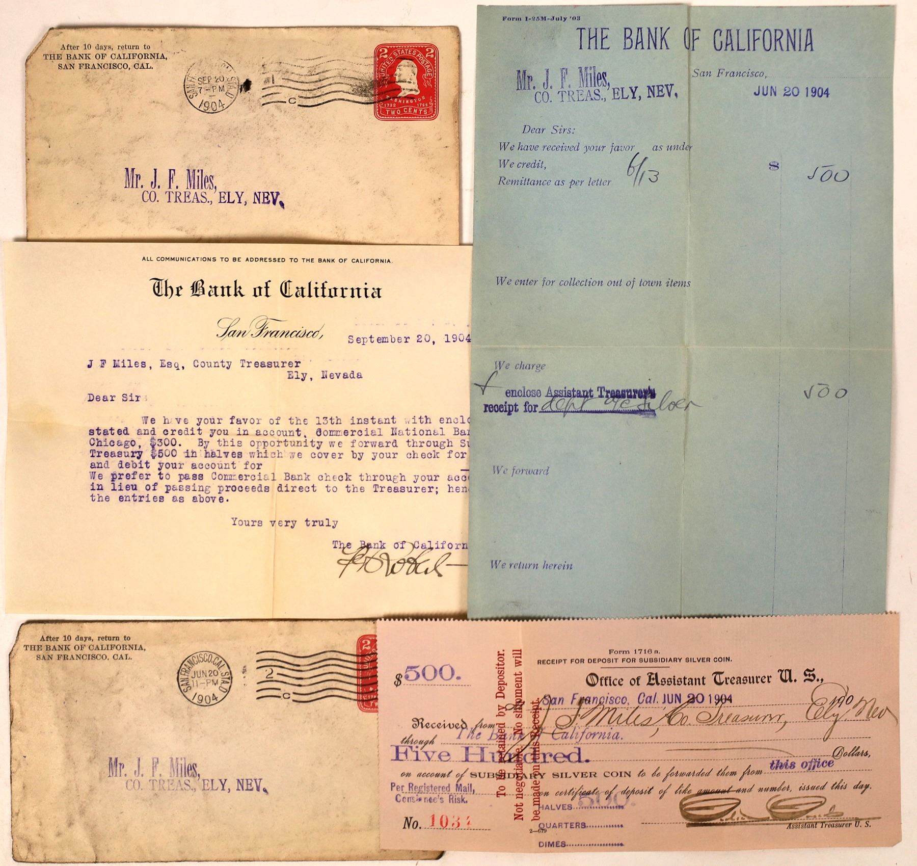 Includes two requests for $500 n half dollars and a receipt for sending them to J. F. Miles County Treasurer. Two Bank of California corner advertising covers included. Also a cute business card for W. S. Lammon of the San Pablo Office of the American Bank. “Today’s Pennies are Tomorrow’s Dollars.” (W. D. Miles Collection)