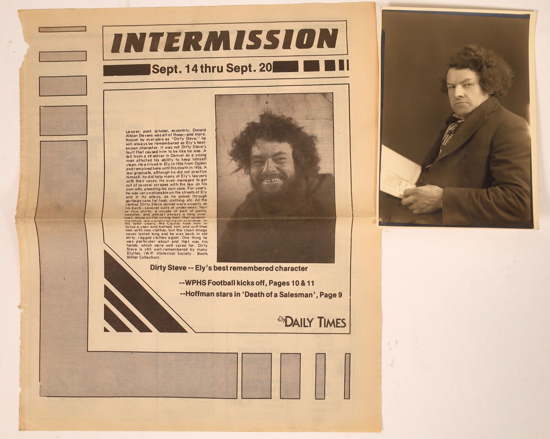 You have to read the biography in the Ely Daily Times to appreciate this photo. Lawyer, poet, scholar, eccentric, Donald Albion Stevens was all of these and more. Known by everyone as Dirty Steve, he will always be remembered as Ely's bet known character. It was not Dirty Steve's fault that caused him to be like he was. A fall from a streetcar as a young man. He arrived in Ely in 1906 and passed away in 1936. Photo measures 7 x 5". (W. D. Miles Collection)
