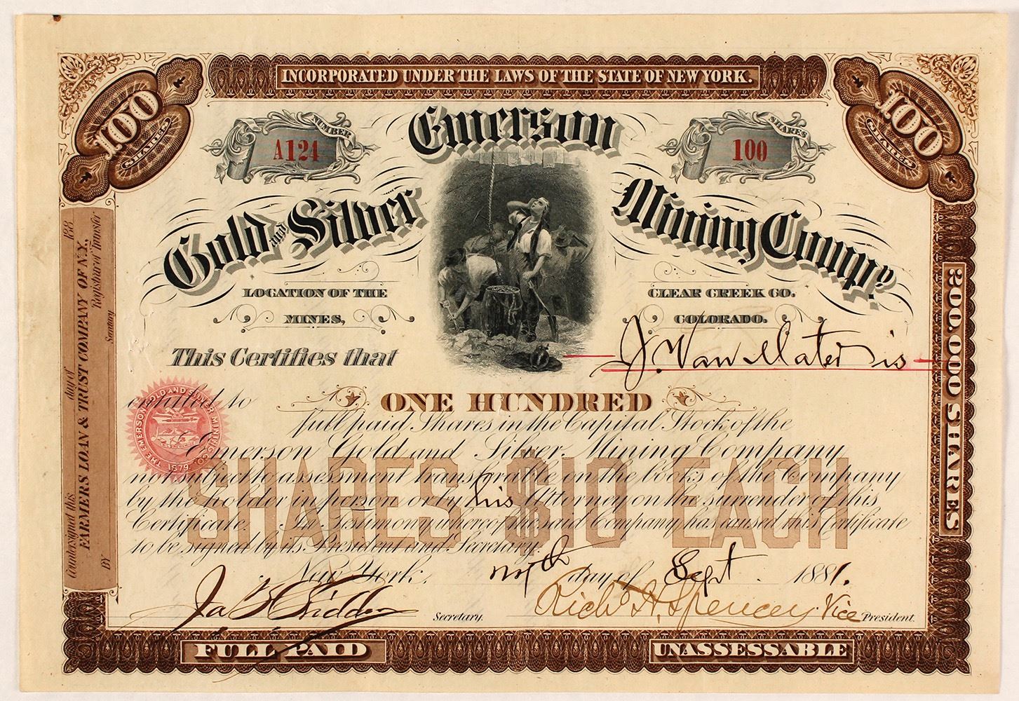 Inc. in New York. No. A124, issued for 10o shares to J. Van Water on Sept. 24th, 1881. Signed by the vice-president and secretary. Not cancelled. Brown border with vignette of miners hoisting ore bucket. Folds, very fine. 6.75 x 9.75" Location printed on certificate: Clear Creek Co., Colorado. Owned the John L. Emerson, Asteroid, John L. Extension, Lucia, Bessie, Emma Colwell, Ralph Waldo and John Louville lodes within the Virginia District near Idaho Springs. The ore contained gold and silver that ran 1-3 oz/ton gold and 50 oz/ton silver. The Emerson had developed by 375 feet of drifts and a 225' shaft. The other claims had considerable work as well. [Ref: Corregan & Lingane, pg. 133] (Al Adams Gold Rush Memorabilia Collection) Date: Location: Clear Creek County, Colorado HWAC# 58427