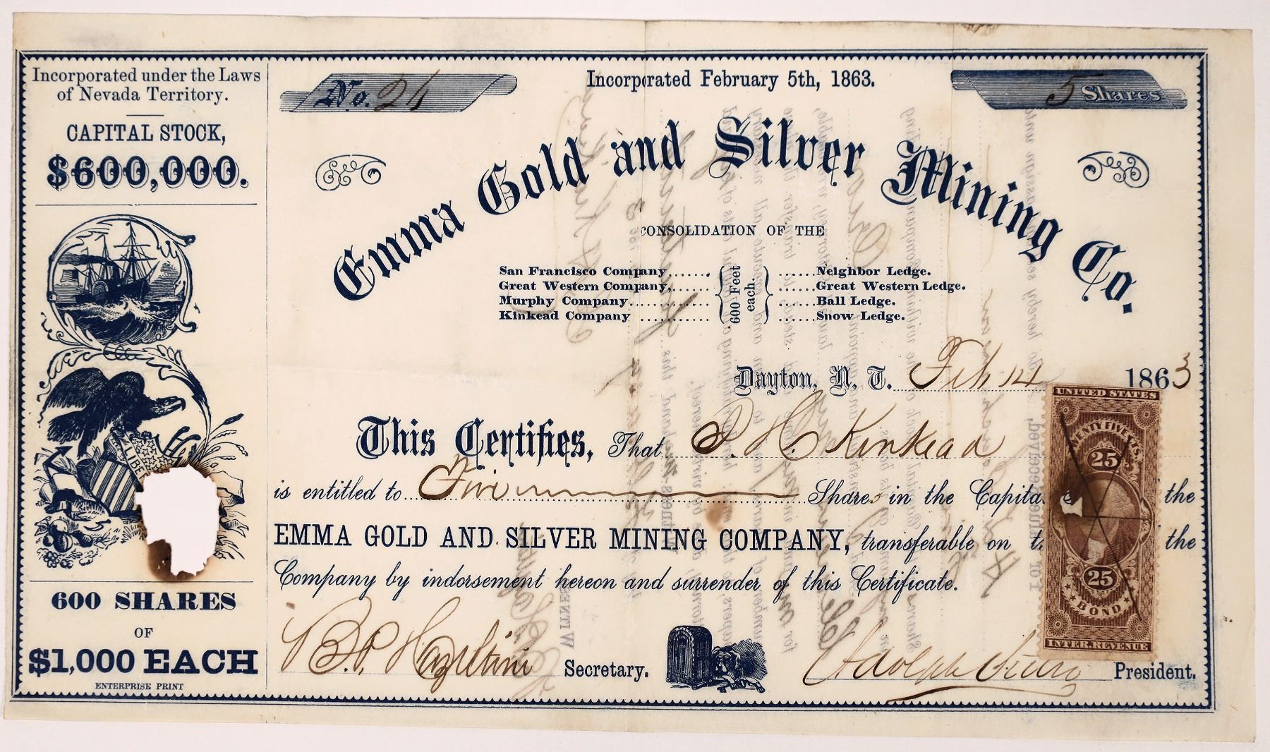 Emma Gold and Silver Mining Company Stock, Dayton, Lyon County, Nevada Territory. Cert. #26 dated Feb. 14, 1863, issued to J. H. Kinkead, a future governor of Nevada, for 5 shares on. Incorporated in Nevada Territory and capitalized at $600,000; 600 shares at $1000 per. Datelined Dayton, N.T. Signed by Adolph Sutro as President and B. P. Hazeltine as Secretary. The mining company was a consolidation of 4 ledges and prior mining companies: San Francisco Company - Neighbor Ledge, the Great Western Company - Great Western Ledge, the Murphy Company - Ball Ledge, and the Kinkead Company - Snow Ledge, all into one company. Two vignettes at leftóone of a ship and the second of an eagleóa small dog and safe vignette at bottom, and a rare partially imperforate 25-centt. Bond Internal Revenue stamp affixed at right. Uncancelled. Printer-Enterprise Print. According to one authority, "The Emma was a claim named after Sutro's daughter. It was near the Sutro Tunnel entrance, located up in the hills near the #1 shaft for the Tunnel. Hazeltine was a partner in a clothing store in Dayton with Sise" [Holabird, 2000, 83]. There is a small burn hole at far left affecting the bottom of one of the vignettes. Extra rare. Dayton Nevada 1863