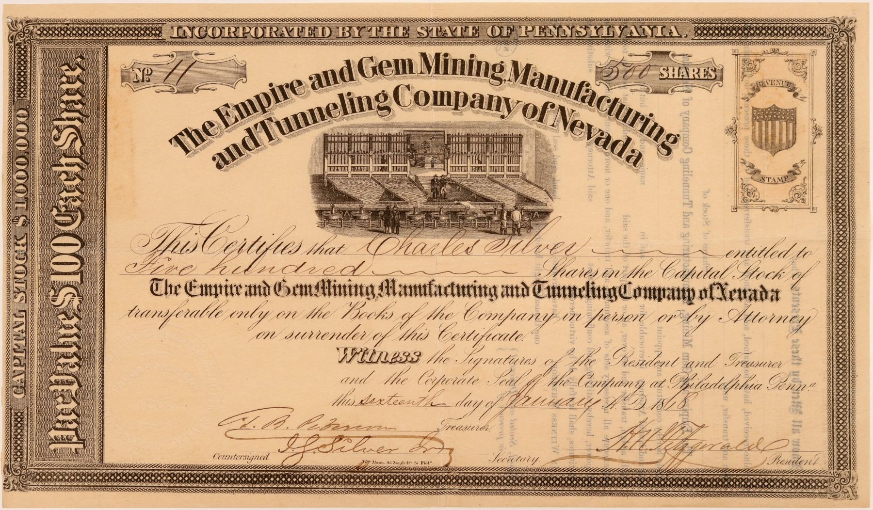 White Pine District, Nevada. Wow! Inc. in Pennsylvania, 1867. Low number 11, issued for 500 shares to Charles Silver on January 16th, 1868 in Philadelphia. Signed by president HH Fitzgerald, secretary Silver, and the treasurer. Not cancelled. Black border and print. Fantastic vignette showing the inside of a stamp mill! Printed by Wm. Mann, Philadelphia. Pinholes, folds, toning. 6.25 x 10.5" This company is a mystery to us. These pieces are very rare, and the few (one) we have sold before we have never been able to firmly locate. No articles found on CDNC or newspapers.com. A key here is the tie to a gem mining company, and this may be the first gem company in Nevada at the height of the 1860's silver boom in Nevada. The question is "what gem were they after?" Was it turquoise? amethyst? The exact location is a mystery still. There was an Empire Mine on the Comstock and in White Pine County. There was also a Gem Mine in White Pine County (Raymond,1870). The fact that the Empire was a producer in the White Pine District in 1868 as reported by Raymond in 1869 (p98), leads us to believe that the Gem was a mining claim adjacent to the Empire. Were there any gems associated with it? we may never know. We believe the data points to this being a White Pine County piece. City: State: Nevada Date: 1868