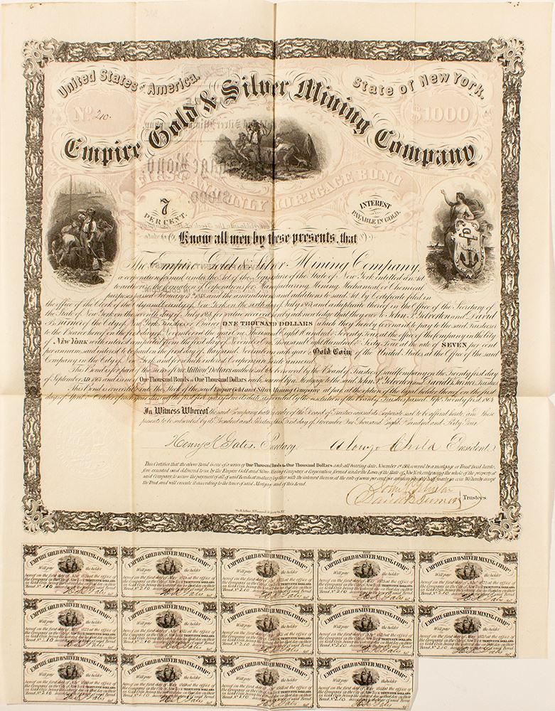 Very early Bodie. Although the corporation formed in New York, the mine was in Bodie, CA. Gray colored ornate bond with a black border. $1,000 gold coin. Bond No. 210. Three vignettes: miners working underground, miners working above ground, and Columbia with a shield. Fourteen coupons attached, all signed by H. K. Gates. The bond paid seven per cent per annum, payable in two payments in May and November. Signed by Henry K. Gates, Secretary, Alonzo Child, President, John P. Yelverton and David B. Turner, Trustees. Folds with light toning.16.75"x 13.25" (Prag Collection)