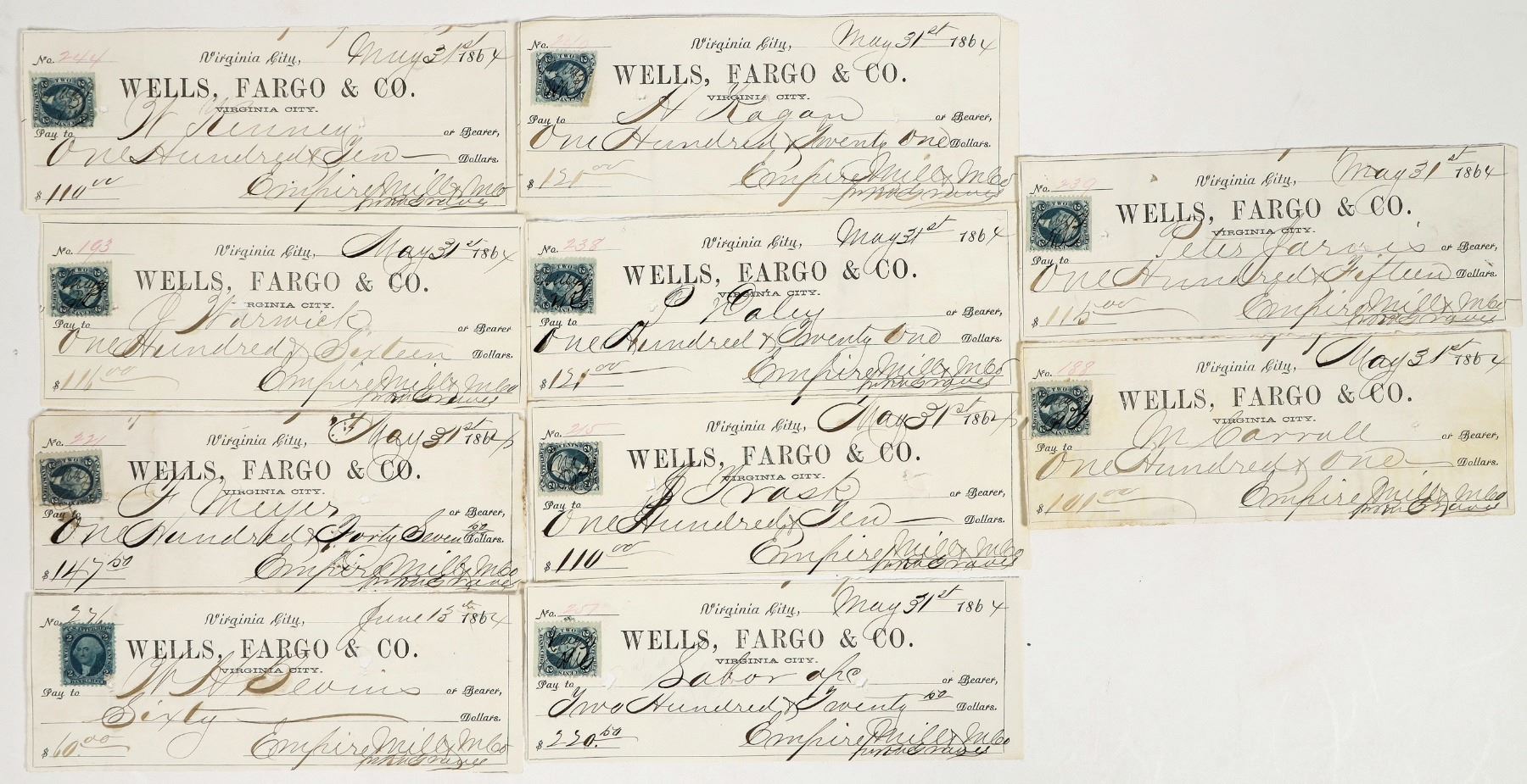 Lot of 10 Wells Fargo territorial checks issued in 1864 by the Empire Mill & Mining Company, signed by RN Graves as supt. All have a US IR stamp. The Empire Mine was located in Gold Hill. It was staked in 1859 and became part of the Consolidated Imperial in 1876. RN Graves also worked for the Gould & Curry. Nice resale group.