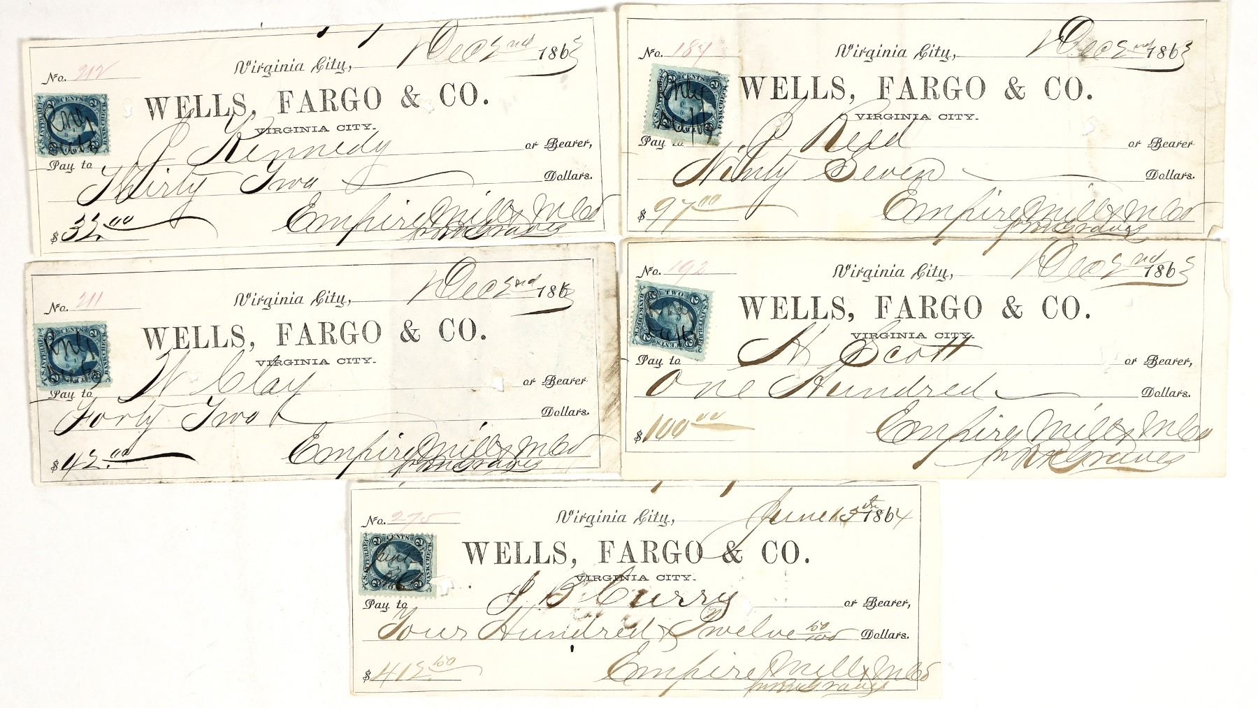Lot of 5 Wells Fargo checks issued in 1863 by the Empire Mill & Mining Company. All signed by RN Graves as superintendent. Each has a US IR stamp. The Empire Mine was located in Gold Hill. It was one of the original claims on "Little Gold Hill", which included the Bowers, Plato, Consolidated, Empire, and Imperial mines. They produced around $12,000,000 by 1866 ‚ an astronomical sum during the 1860s. All the mines of "Little Gold Hill" were consolidated as the Consolidated Imperial in 1876.