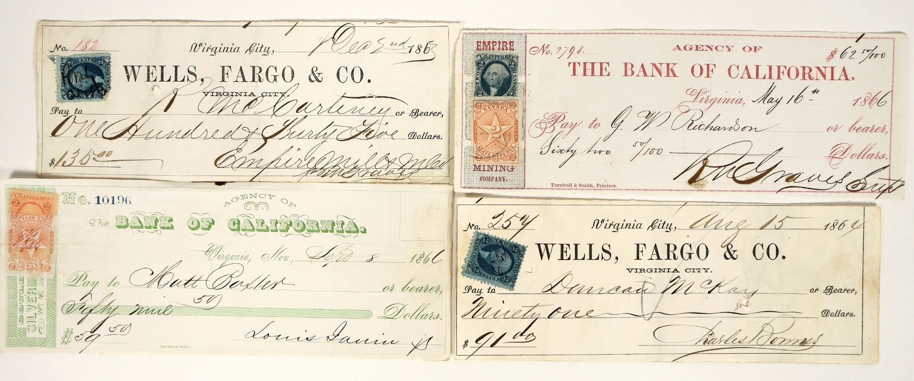 Lot of 4 different. This is a fun group of 2 pairs each, a territorial and then a later check, for two different Comstock mines. Includes: 1863 and 1866 Empire Mill & Mining Co. checks, both signed by RN Graves; and 1864 and 1866 Gould & Curry checks, the first signed by Charles Bonner and the second signed by Louis Janin Jr. The two early checks have US IR stamps. The later two checks also have NV adhesive stamps.