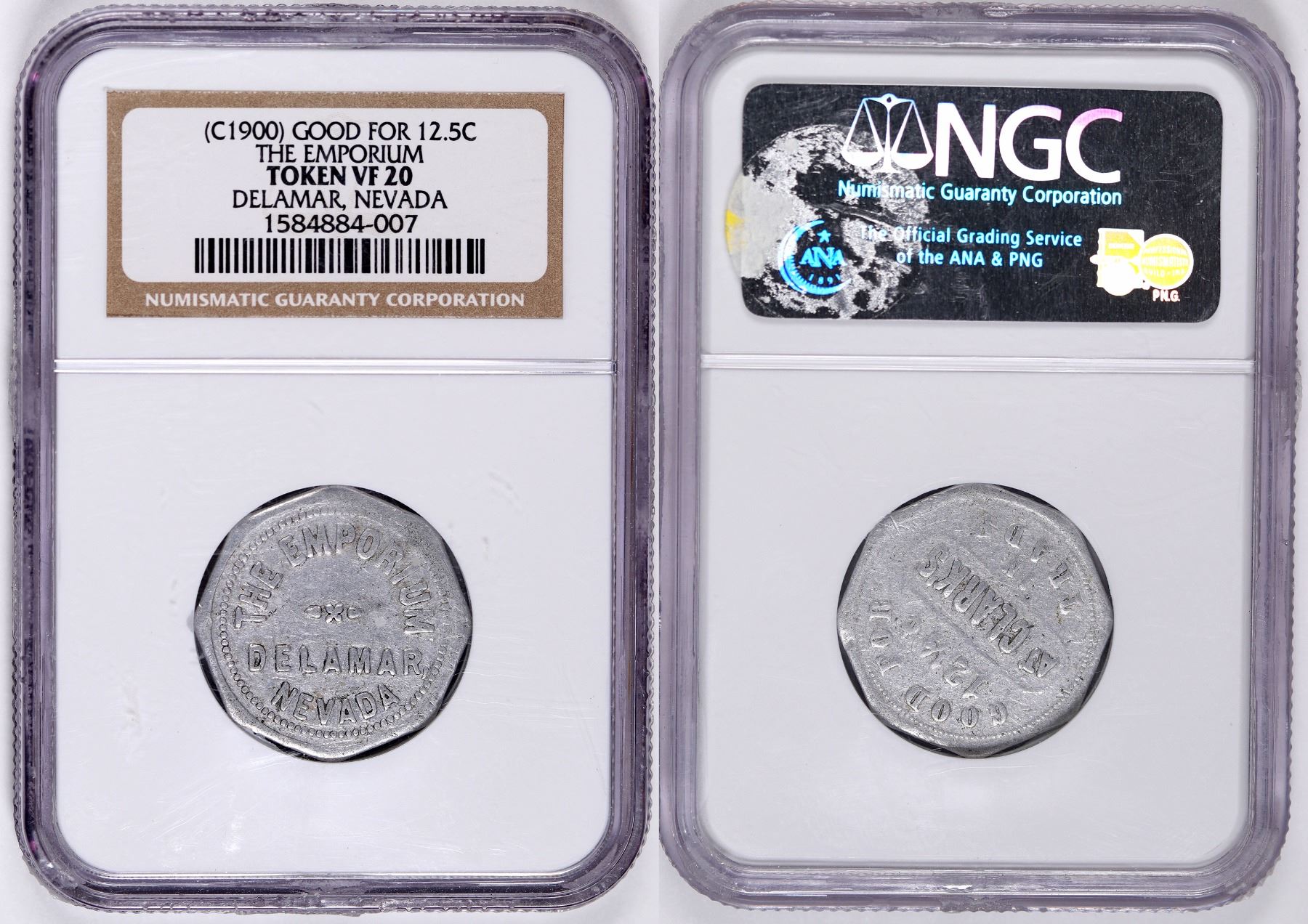 Aluminum, octagonal, 25 mm. NGC VF 20.