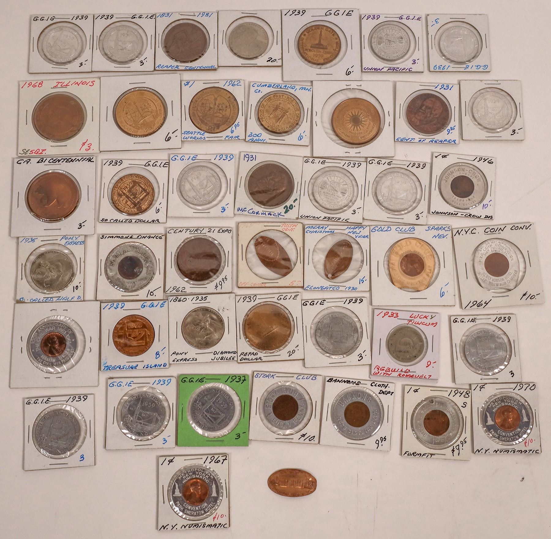Large lot of encased pennies (10); elongated coins (3); Pony Express Centennial (3); Golden Gate Exposition San Francisco 1939 (15); Seattle World's Fair (2); and several others. City: State: Date: