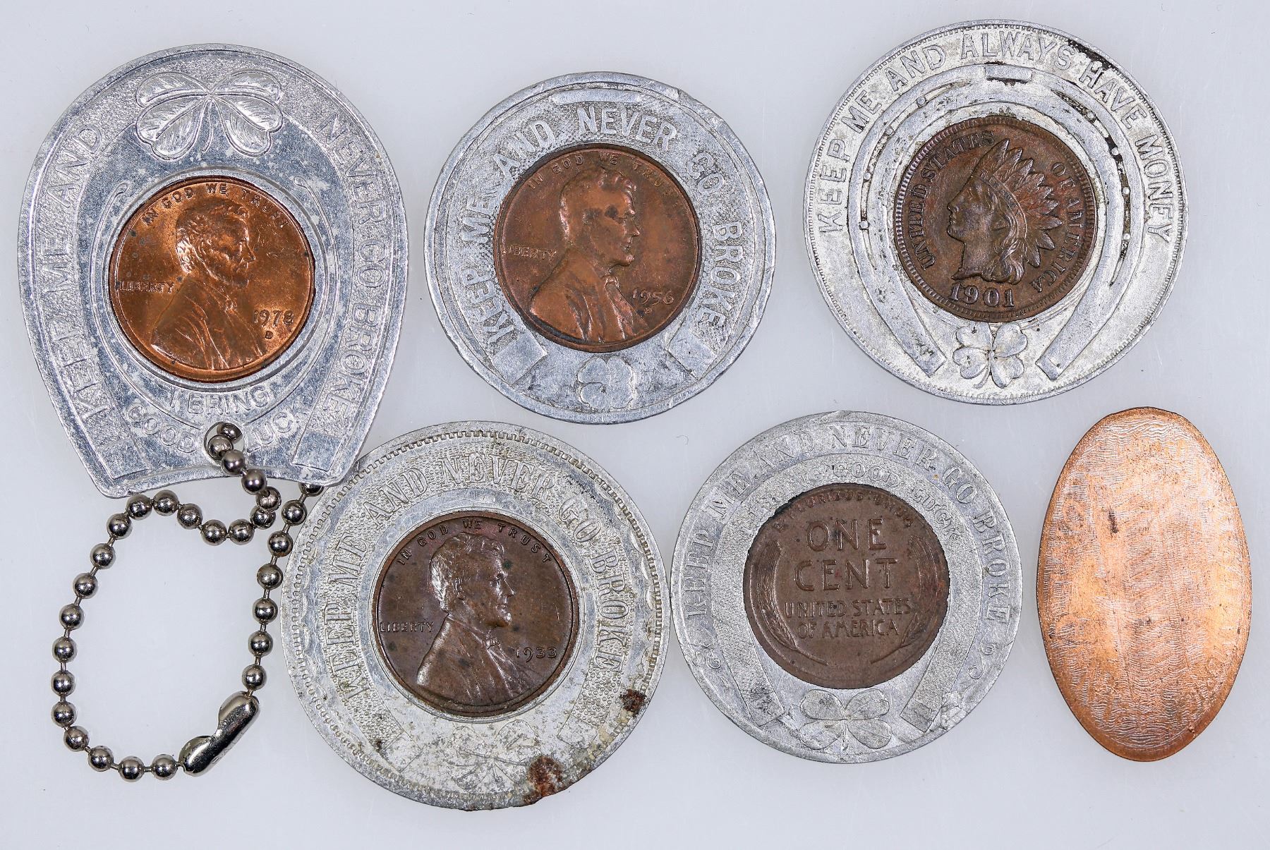 Five encased pennies and an elongated cent. 1) P. V. Banks, Freedom, California 1956-D; 2) Jolley's Drive In Markets, 1933; 3) Crawford Co. National Bank, 1978-D; 4) G. L. Vance "The Furniture Man" Joliet Illinois, 1901 Indian Head; 5) Kelly & Kerr Springfield, Missouri 1912-D.